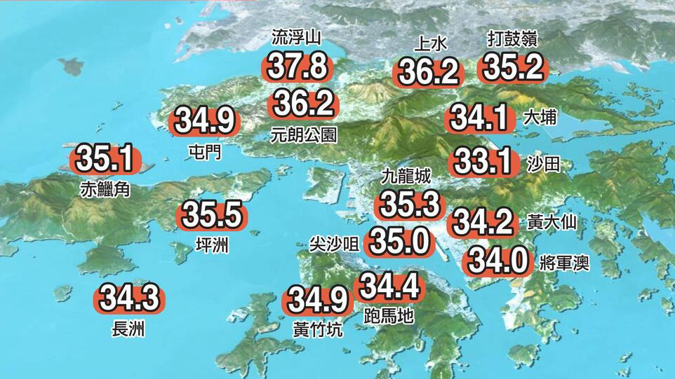 天文台今日(10日)表示,截至下午12時40分,天文台總部錄得最高氣溫35度,是今年以來最高,流浮山氣溫更高達37.8度,打破相關氣象站自1985年設立以來的最高紀錄。