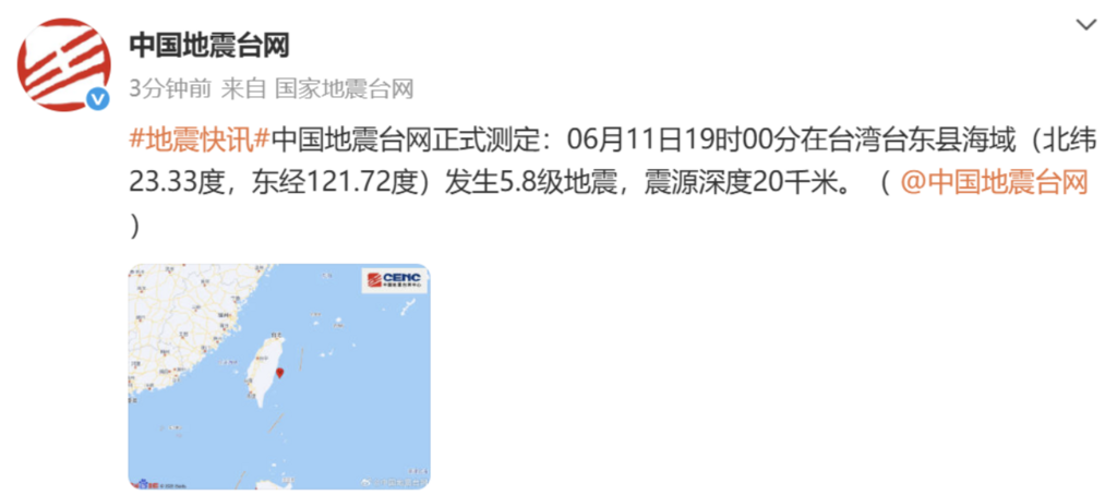 中國地震臺網正式測定:06月11日19時00分在台灣台東縣海域(北緯23.33度,東經121.72度)發生5.8級地震,震源深度20千米。