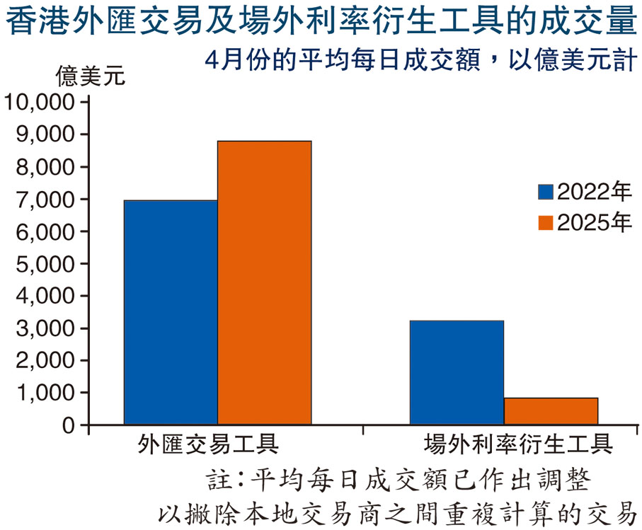 香港同時維持全球最大離岸人民幣外匯及場外利率衍生工具中心的地位。人民幣外匯交易平均每日成交金額由2022年4月的1,912億美元,增長64.8%至2025年4月的3,151億美元。人民幣場外利率衍生工具的平均每日成交金額亦由2022年4月的147億美元,增長67.1%至2025年4月的245億美元。場外利率衍生工具方面,香港在2025年4月的平均每日成交金額為841億美元,其中以美元、人民幣及澳洲元場外利率衍生工具在香港市場交易最為活躍。