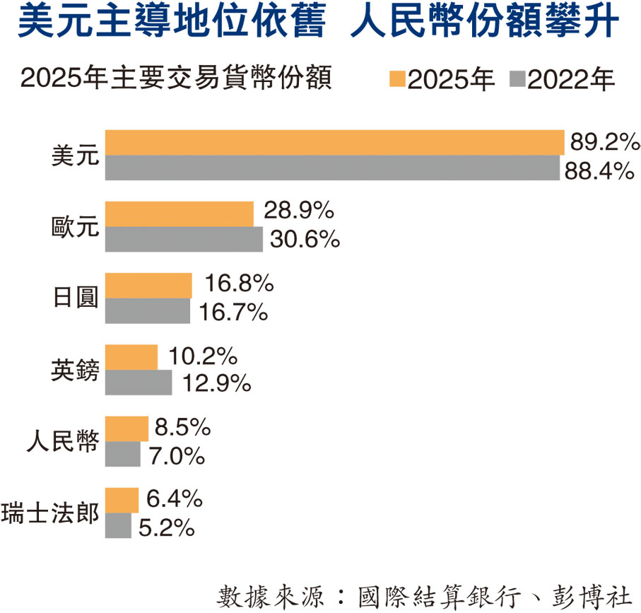 有外資銀行分析員表示,中國多年來,一直致力提升人民幣對全球的吸引力,為此,內地更放鬆了部分資本管制,旨在削弱美元的主導地位。新加坡銀行外匯策略師Moh Siong Sim亦表示,隨着人民幣國際化進程取得進展,人民幣交易量正迅速逼近英鎊。不過,現時內地的跨境資本流動限制等措施仍在,使得美元的全球主導地位仍未能撼動。在全球“去美元化”風潮下,瑞士法郎的交易量亦見大幅上漲。BIS的調查發現,瑞郎的日均交易量升至6,116億美元,超過澳洲元及加元,成為第6大交易貨幣。港元的份額也顯著上升,從2.6%升至3.8%。