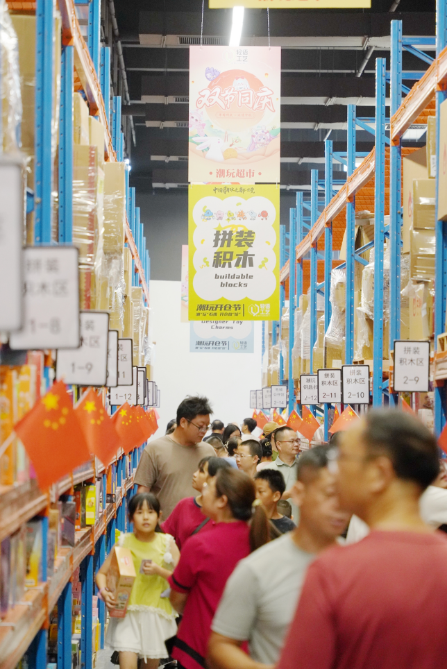國慶節當天,5萬平方潮玩超市在D館首開3000㎡潮玩倉儲式賣場,成為人氣焦點。超萬個潮玩SKU涵蓋盲盒、手辦、模型、拼裝積木等全品類,以極具吸引力的價格“開倉放價”,吸引了衆多潮玩愛好者前來“掃貨”。現場消費者穿梭在貨架間,直言“彷彿跌入了潮玩的海洋,根本停不下來”。現場還送出萬元禮品及優惠券,更以倉儲貨架式銷售搭配會員准入制,會員可享2 - 85折的超值折扣,堪稱潮玩界的“山姆超市”,為消費者帶來前所未有的潮玩消費體驗,掀起國慶消費第一波熱潮。