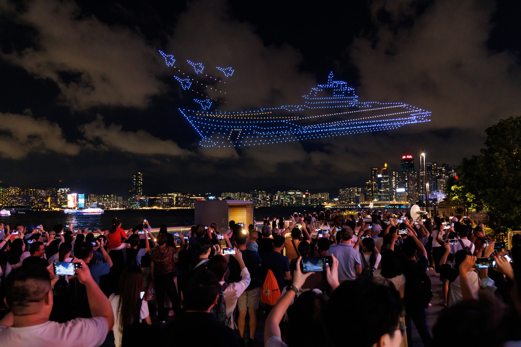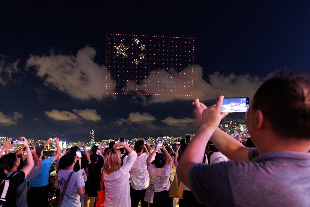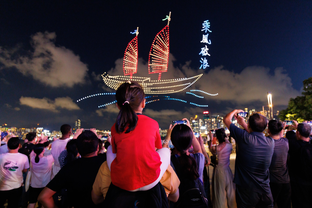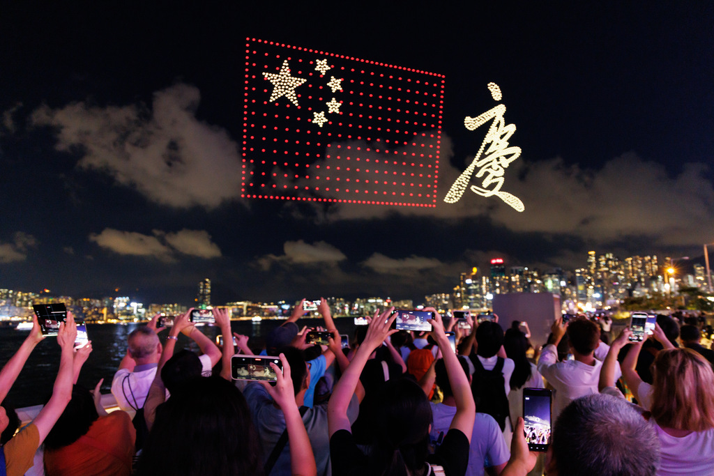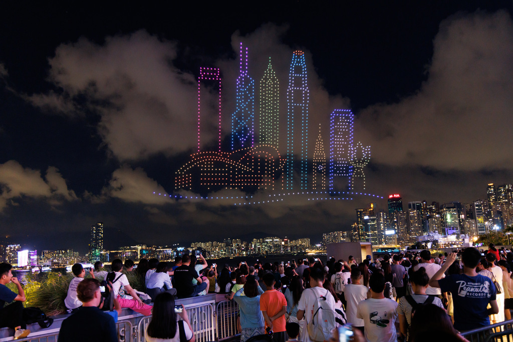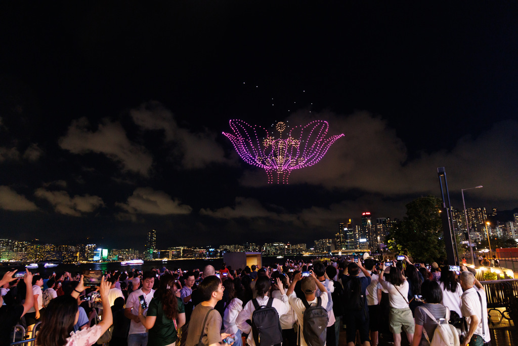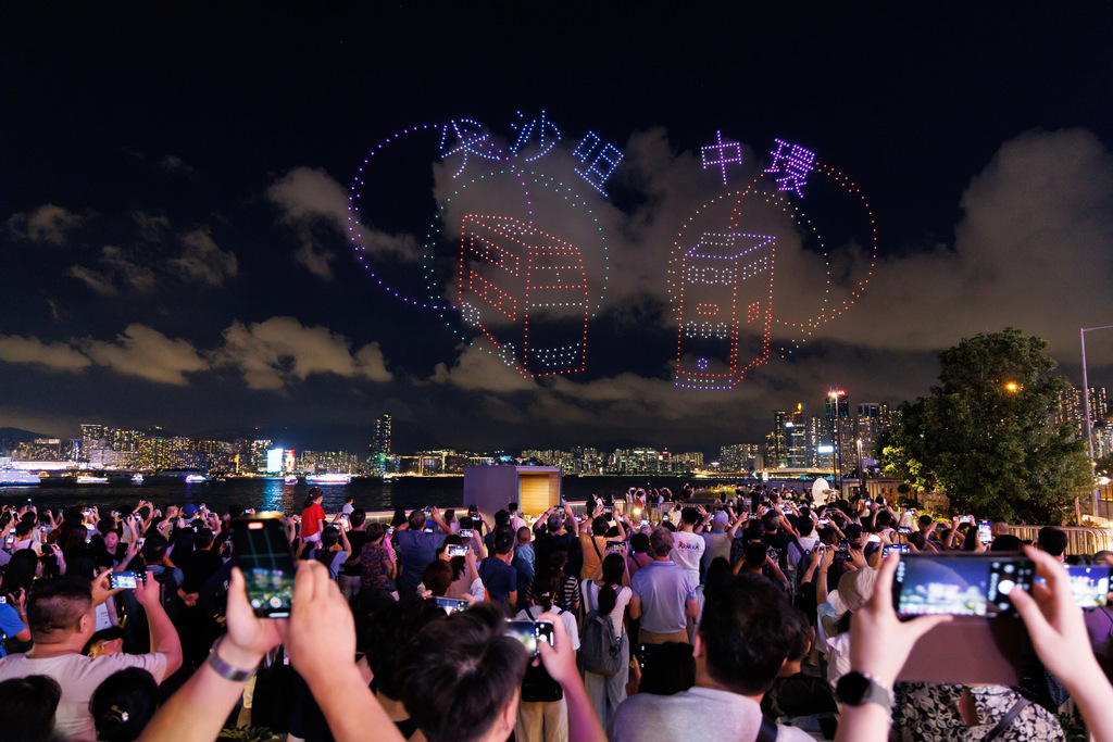 10月2日晚上8時,1200架無人機群騰空而起,點亮灣仔海濱,一幅由無人機精準排列匯聚的巨型五星紅旗在夜空中展開,由紫荊文化集團主辦、紫荊雜誌社承辦的2025年國慶無人機表演準時啟幕。