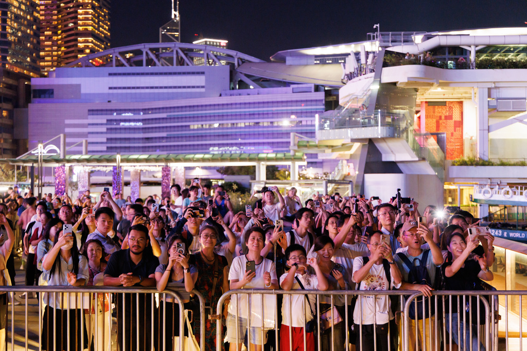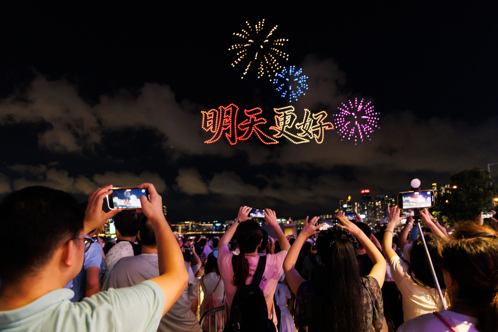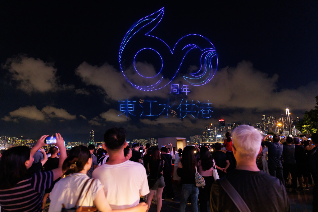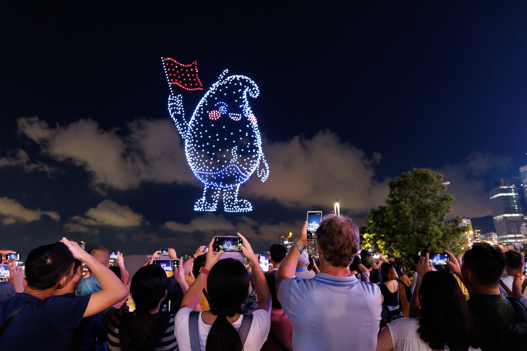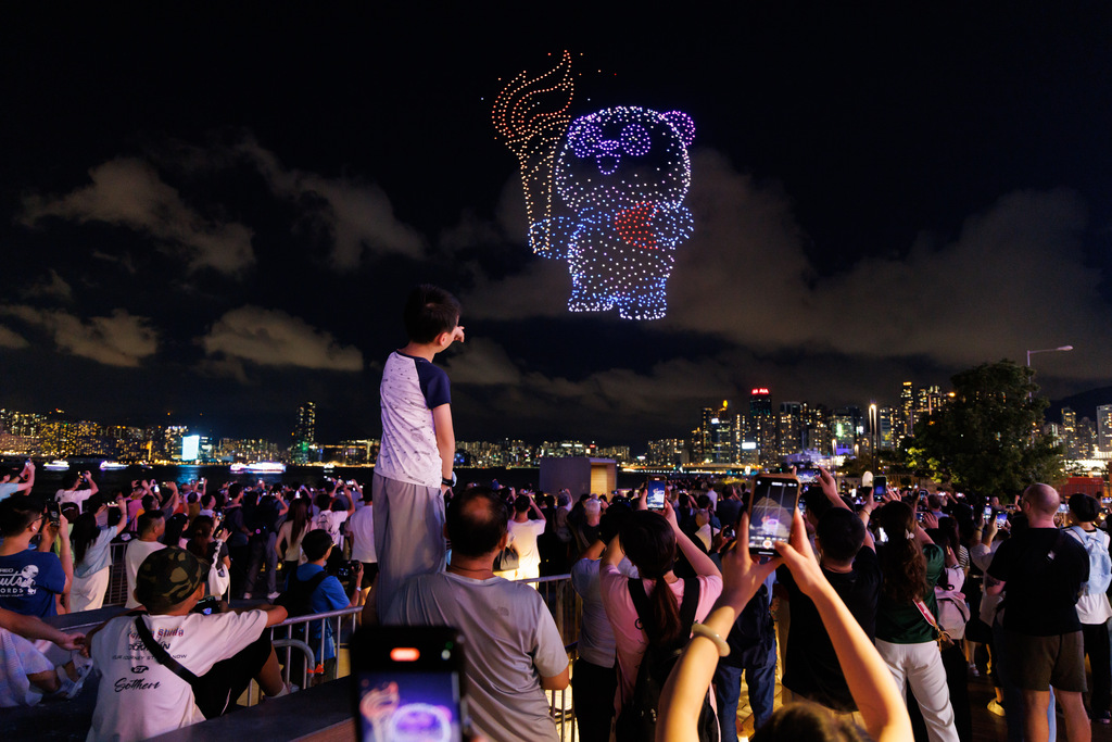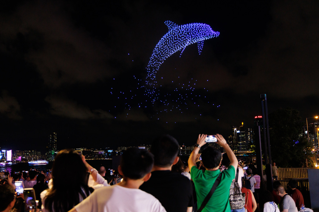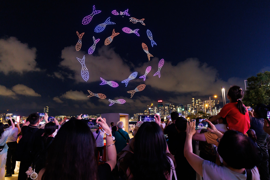 隨著表演推進,無人機巧妙地化成靈動的魚群,遊動匯聚成東江供水60周年的標誌,又如潮水般倏然消散,變換成舉着火炬、手捧愛心的熊貓,迎接第十五屆全國運動會的到來。香港地標、雙層巴士和叮叮車、維港天際線等元素空中與地上交相輝映,如夢似幻。