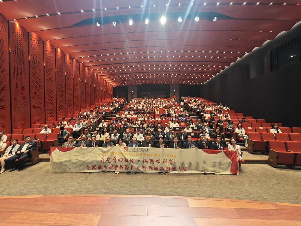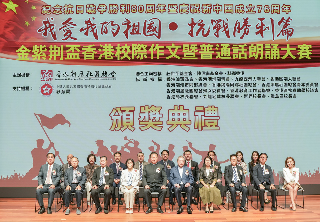 為紀念中國人民抗日戰爭暨世界反法西斯戰爭勝利80周年, 提升香港學生中文寫作及普通話朗誦表達水平,培養濃厚的愛國主義氛圍,由香港潮屬社團總會主辦,莊世平基金會、陳偉南基金會、藝術香港聯合主辦,香港特別行政區政府教育局支持的“我愛我的祖國・抗戰勝利篇”金紫荊杯香港校際作文暨普通話朗誦大賽總決賽暨頒獎典禮,於2025年10月5日在故宮演講廳隆重舉行。