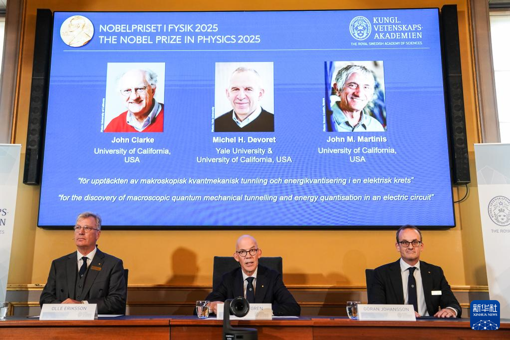 在量子力學誕生百年之際,瑞典皇家科學院7日宣布,將2025年諾貝爾物理學獎授予約翰·克拉克、米歇爾·H·德沃雷和約翰·M·馬蒂尼斯三名量子物理學家,以表彰他們在電路中實現宏觀量子力學隧穿效應和能量量子化方面的貢獻。