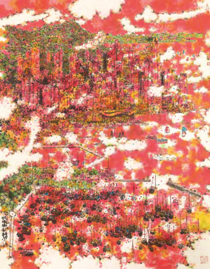 在《都市碎片》中,他摒棄了傳統水墨的線條勾勒,將香港的高樓、街道、車流全部解構為疏密不一的墨點與彩點。遠景的山巒用淡墨點層層暈染,近景的街市則以朱砂、石綠等礦物顏料點簇,墨色的沉靜與色彩的跳躍形成奇妙對話。這種創作打破了「水墨必以墨為主」的傳統,卻又保留了水墨「以少勝多」的寫意精神。看似零散的點,在觀者眼中自然聚合為充滿動感的都市圖景。他曾解釋:「點是最小的視覺單位,卻能承載最多的可能性,就像香港的多元文化,每個個體都在自己的位置上發光,合起來便是一座城市的生命力。」