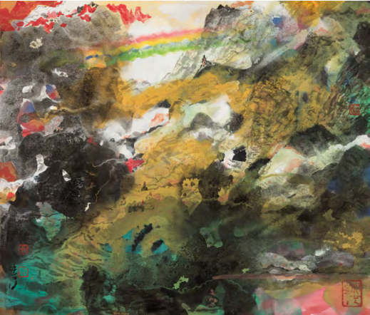 在《高原之魂》中,他將水墨的「寫意」與西方抽象表現主義的「行動繪畫」結合,用大筆蘸取濃墨與赭石,在宣紙上快速揮灑,形成如山脈起伏的肌理,再以金粉點染經堂的屋頂,墨色的沉鬱與金色的璀璨碰撞,仿佛能感受到信仰的力量在天地間流動。這種創作,讓山水從「再現地貌」升華為「精神象征」,水墨的筆墨意趣與現代的精神訴求達成了奇妙的平衡。