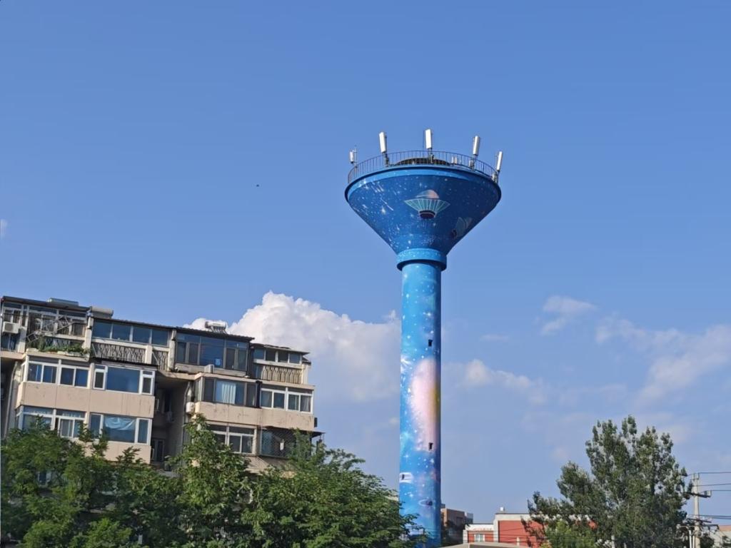 在北京市豐台區新村二里附近,原本斑駁的老水塔“披”上了深邃的星空主題,點點銀白色勾勒出星群的模樣,成了街頭最吸睛的“星空地標”。