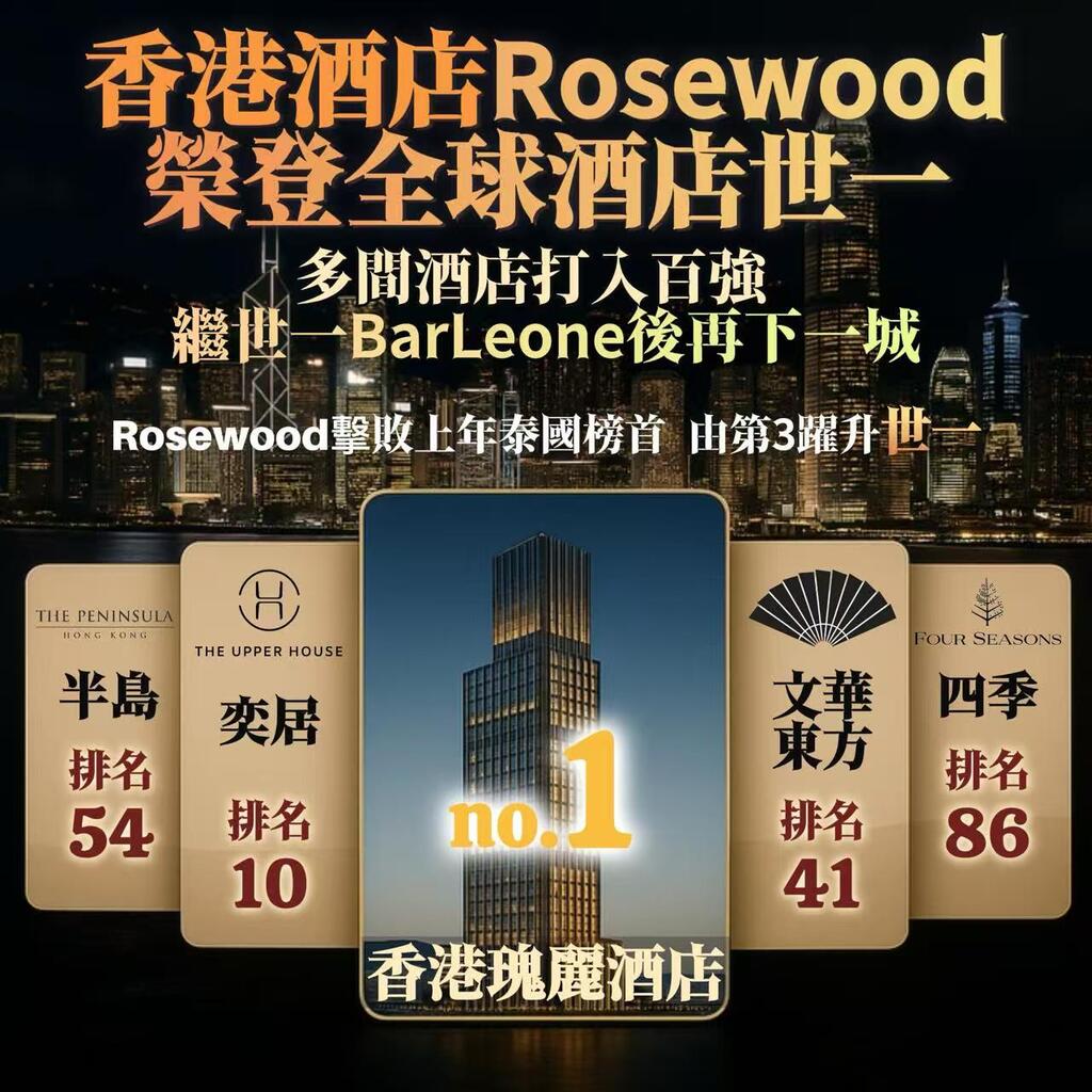 香港瑰麗酒店連升兩位摘桂2025年“世界50最佳酒店”(The World's 50 Best Hotels)榜單揭曉,香港瑰麗酒店(Rosewood Hong Kong)榮膺榜首,較2024年的第三名攀升兩位;去年排名第一的曼谷嘉佩樂酒店(Capella Bangkok)今年則位居第三。
