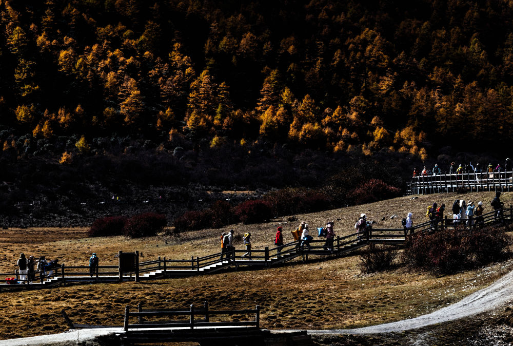 ↑在稻城亞丁景區,遊人沿着步行棧道遊覽(10月29日攝)。新華社發(蘭紅光攝)