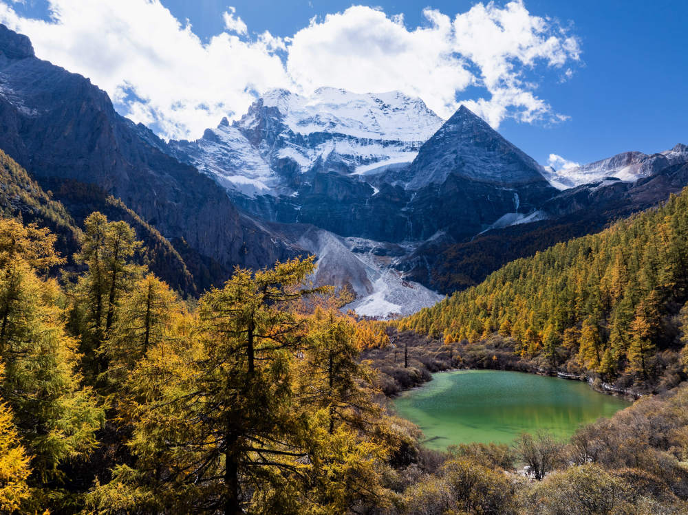 ↑在稻城亞丁景區,藍天、白雲、雪山與彩林相互映襯(10月28日攝)。新華社記者江宏景攝