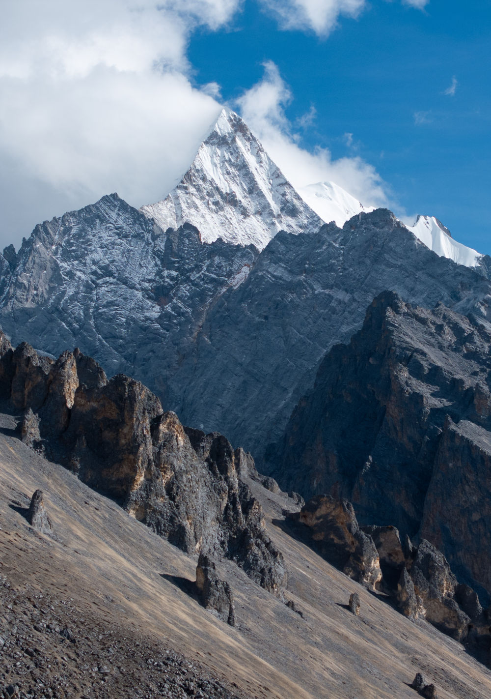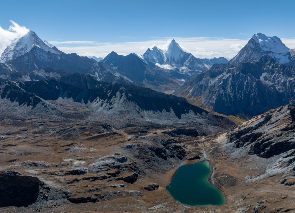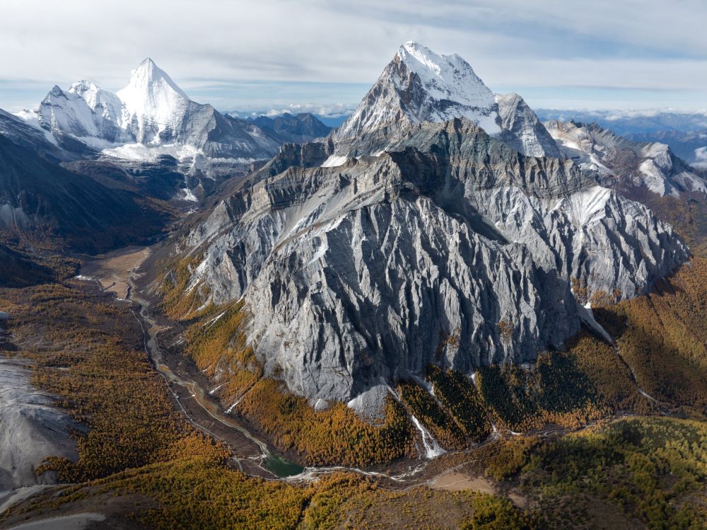 ↑夏諾多吉雪山下的角峰冰川地貌(10月28日攝,無人機照片)。新華社記者江宏景攝