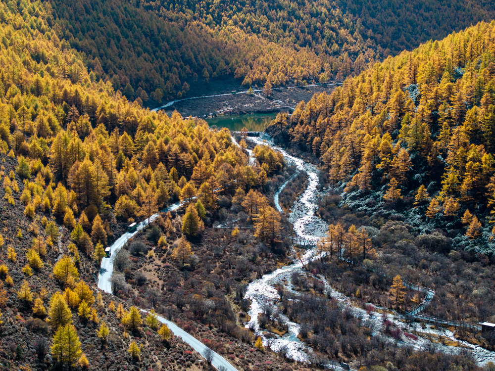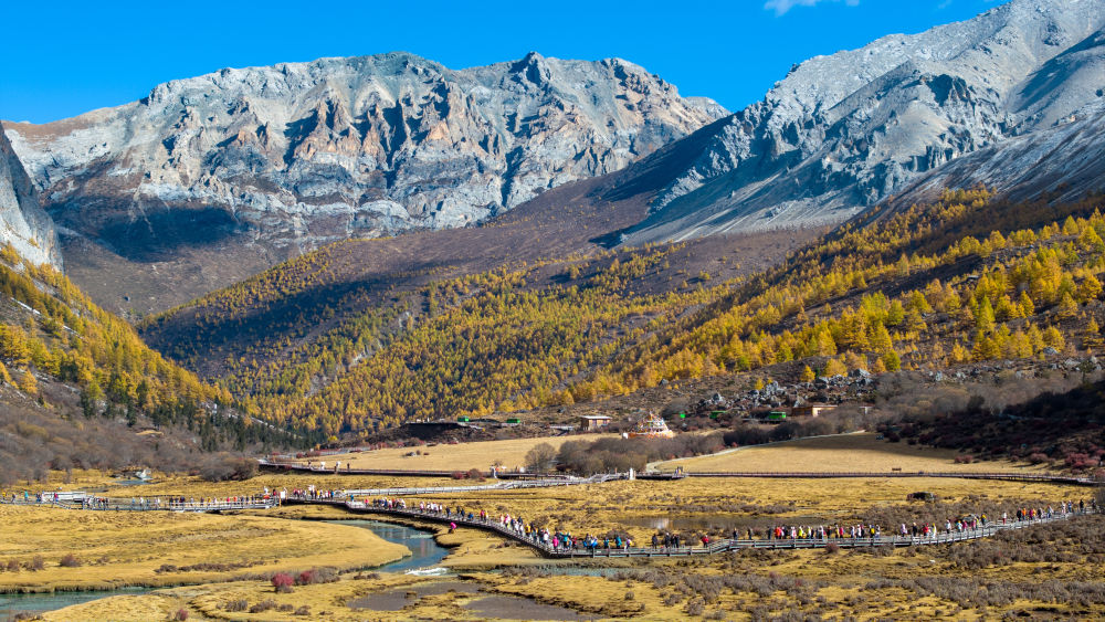 ↑遊人走在稻城亞丁景區洛絨牛場步行棧道上(10月29日攝,無人機照片)。新華社發(翁光建攝)