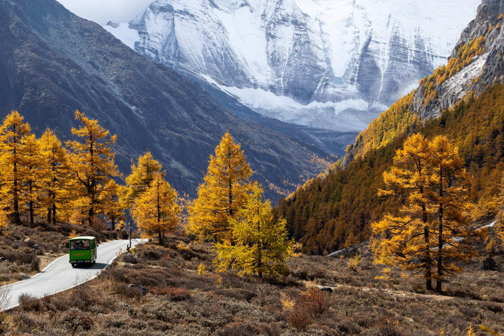 ↑在稻城亞丁景區,一輛擺渡車載着遊客行駛在景區公路上(10月29日攝)。新華社記者江宏景攝