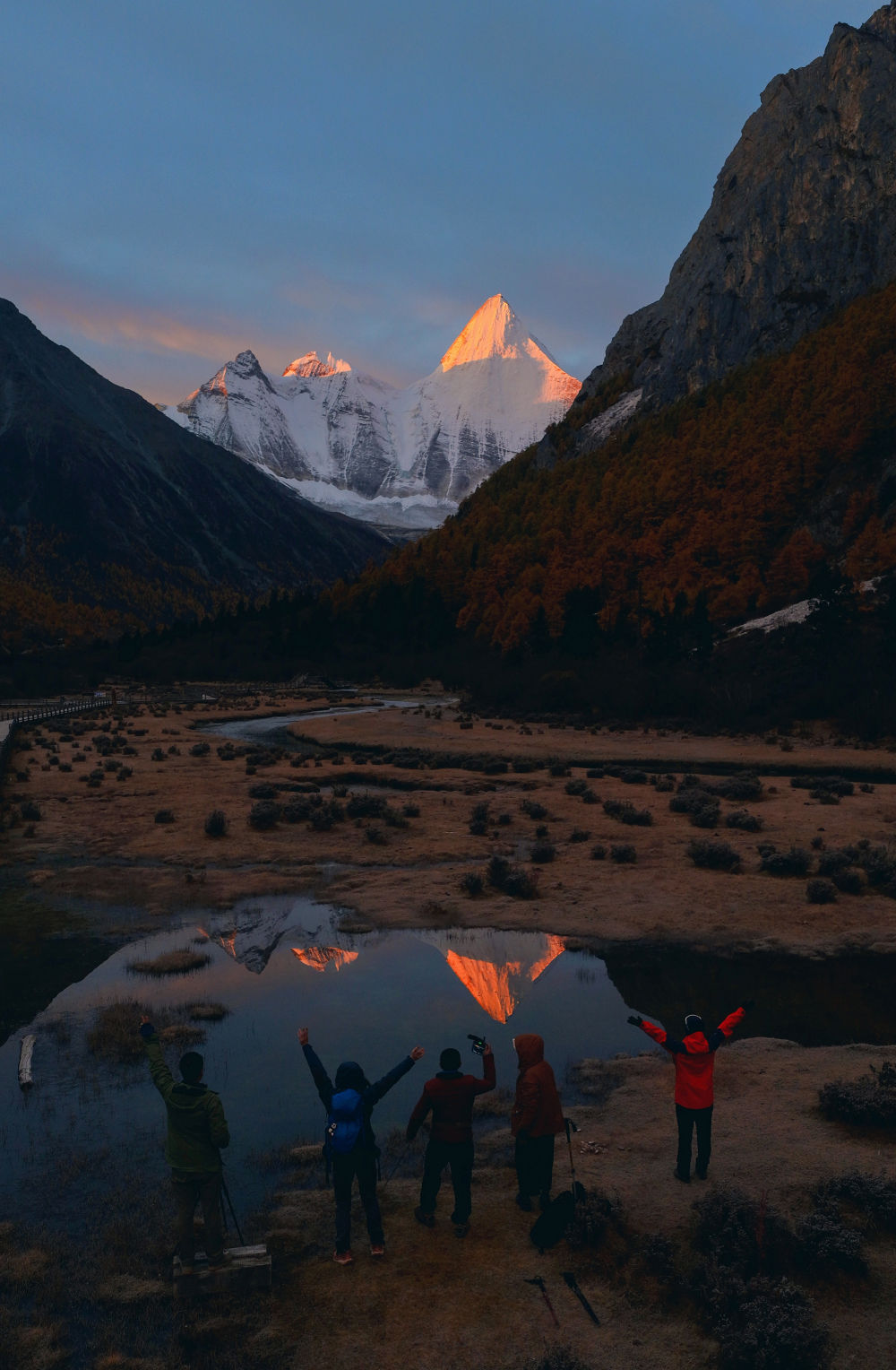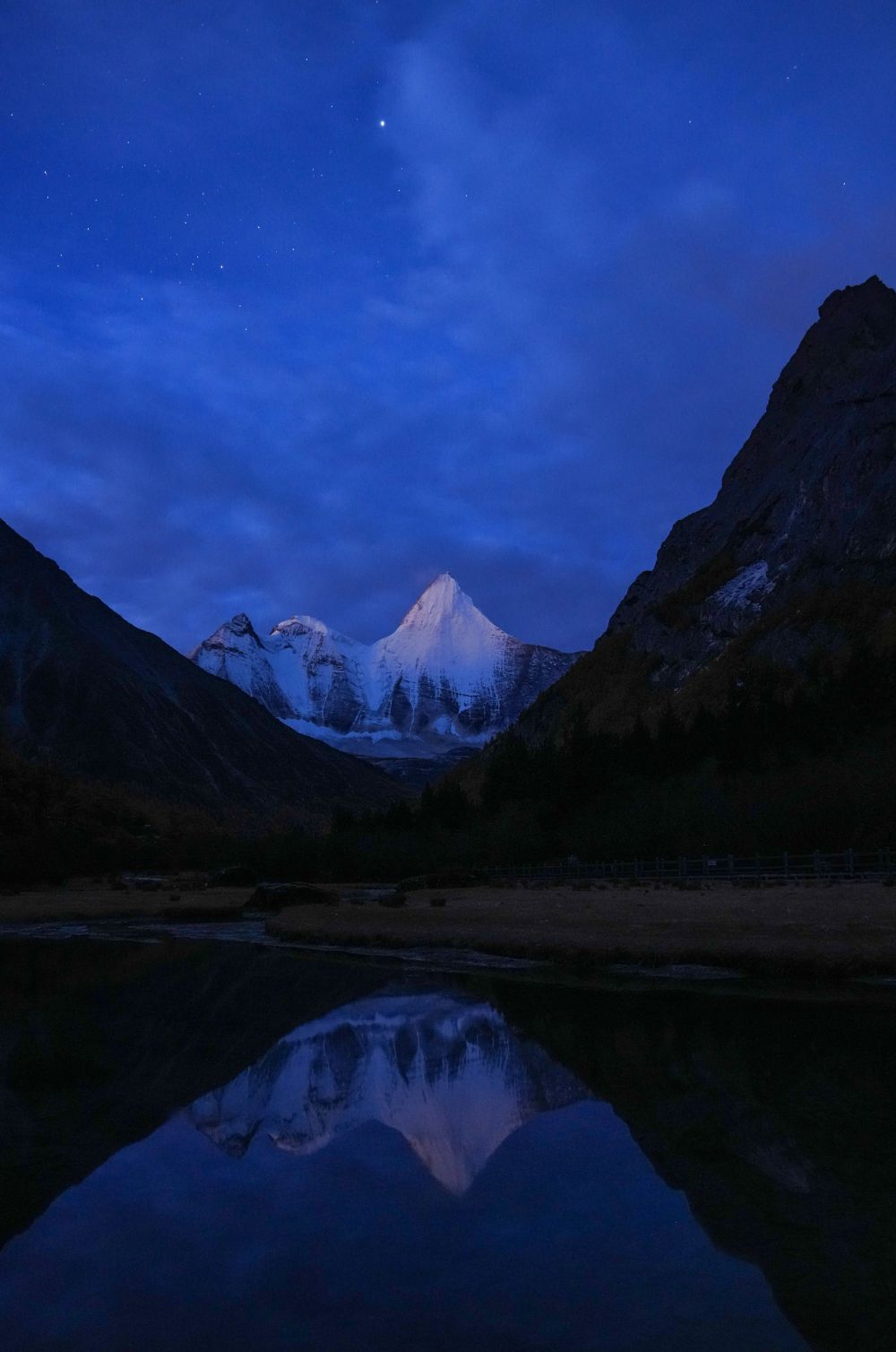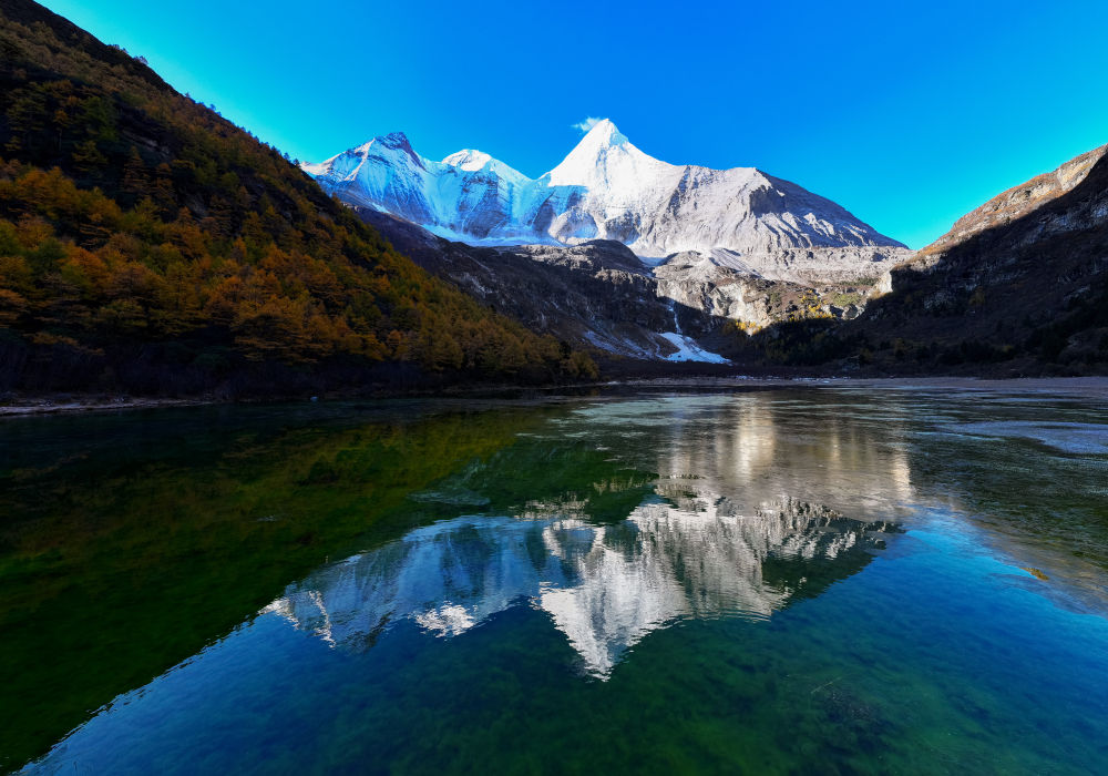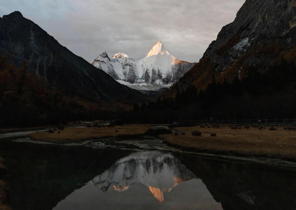 ↑日出時分,央邁勇雪山倒映在水中(10月30日攝)。新華社發(蘭紅光攝)