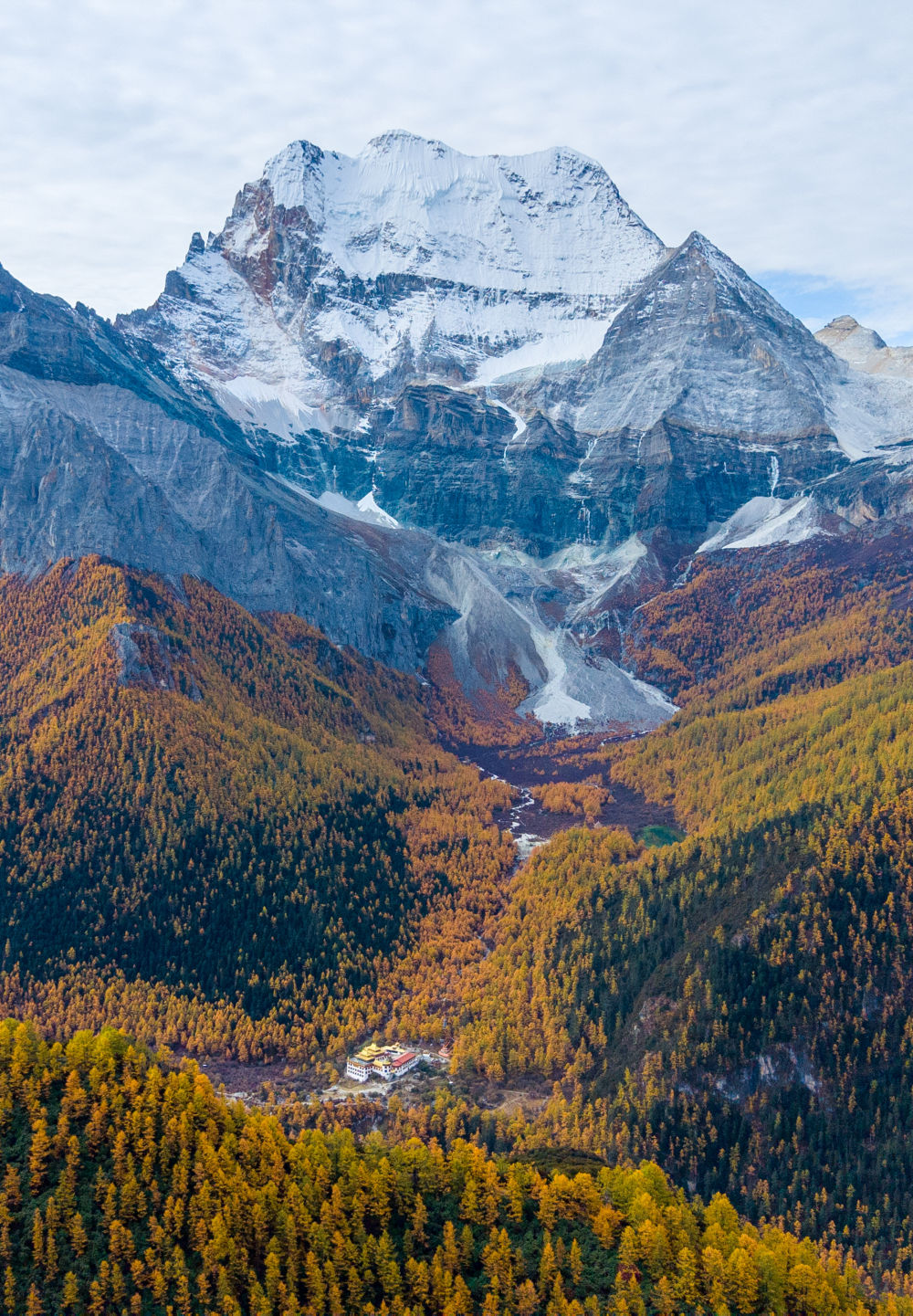 ↑俯瞰仙乃日雪山和彩林(10月30日攝,無人機照片)。新華社發(翁光建攝)