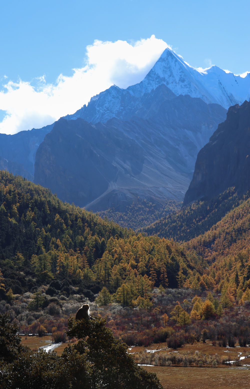 ↑在稻城亞丁景區,一隻藏酋猴站在樹頂曬太陽(10月26日攝)。新華社記者江宏景攝