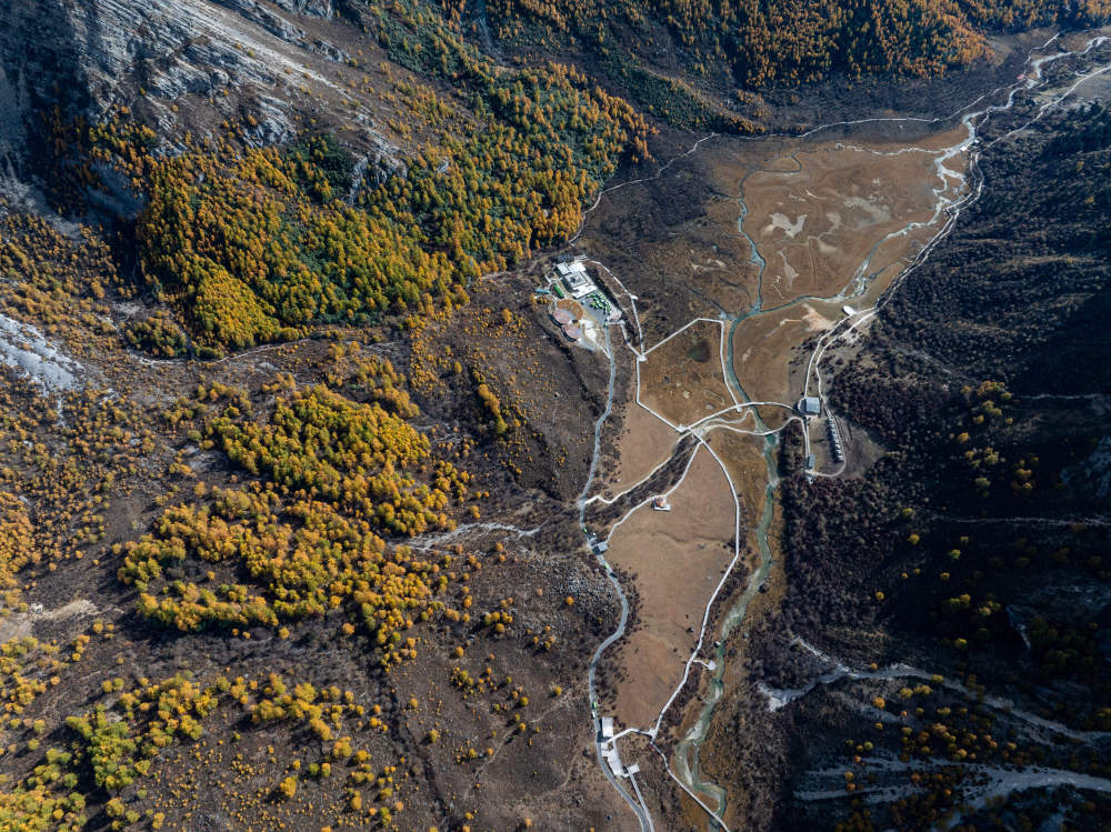 ↑俯瞰稻城亞丁景區洛絨牛場(10月29日攝,無人機照片)。新華社記者江宏景攝