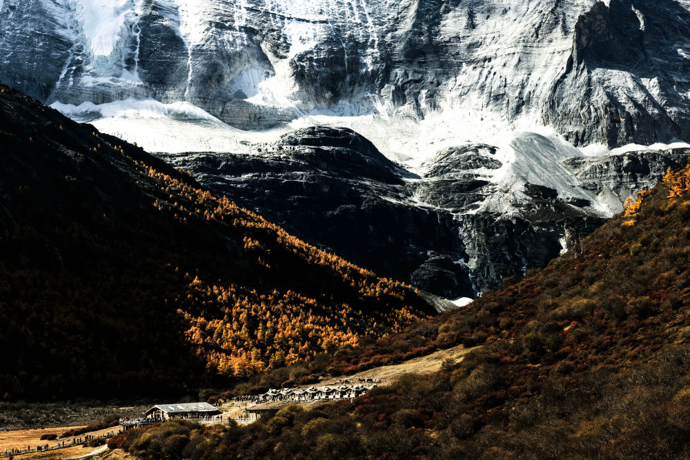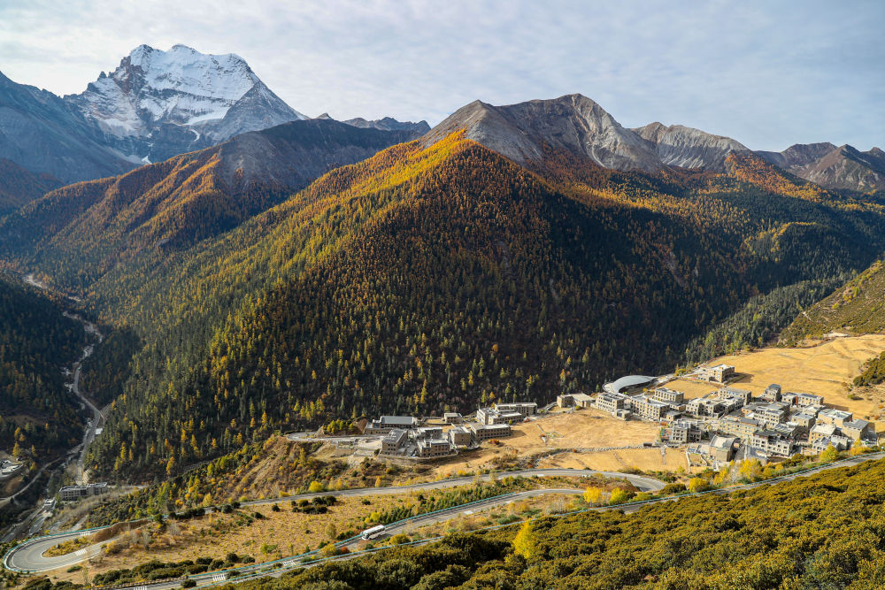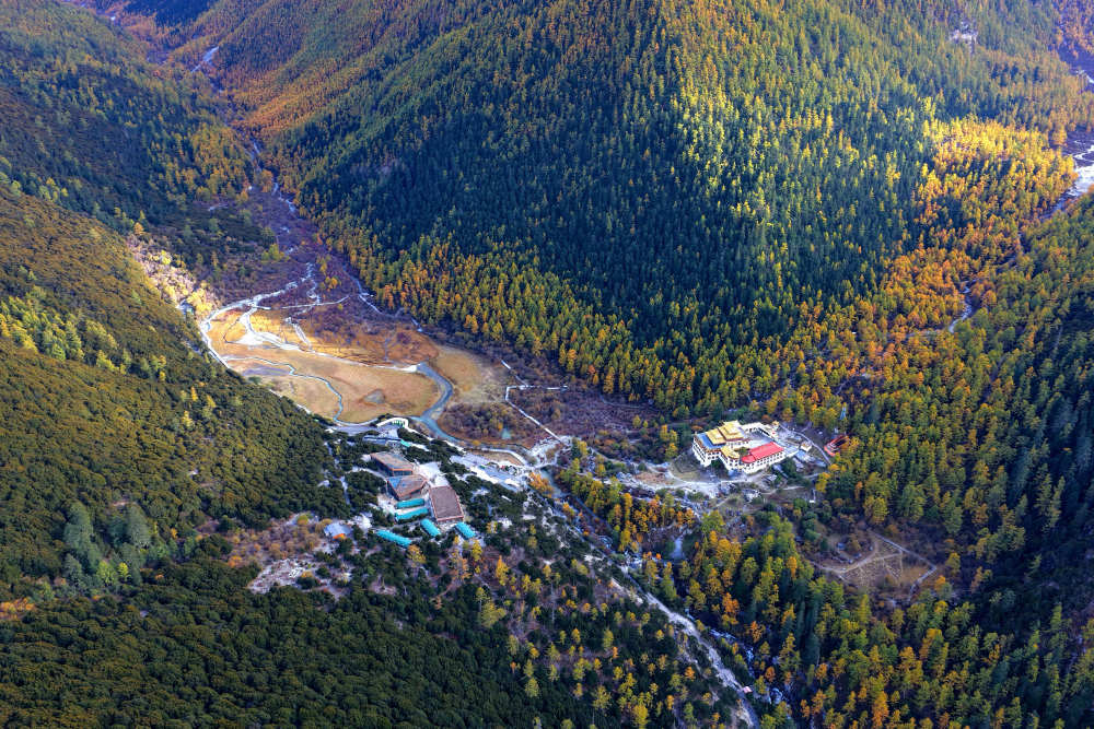 ↑俯瞰雪山下的亞丁村(10月30日攝)。新華社發(莊歌爾攝)