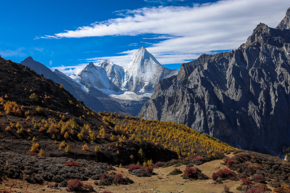↑遠眺夏諾多吉雪山,藍天白雲、雪山與彩林相互映襯(10月26日攝)。新華社記者江宏景攝