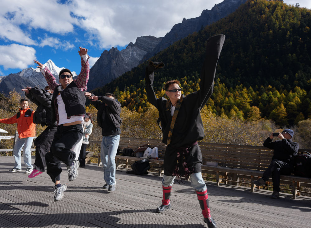 ↑幾位藏族小夥子和遊客一起在衝古寺草甸前跳鍋莊(10月26日攝)。新華社記者江宏景攝
