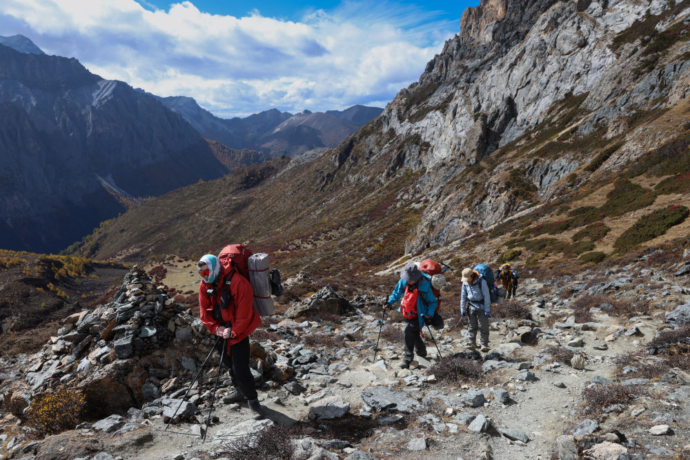 ↑在稻城亞丁景區,徒步愛好者前往波擁措(10月28日攝)。新華社記者江宏景攝