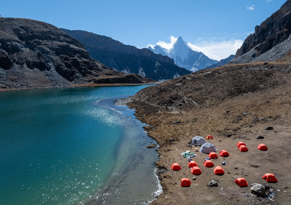 ↑在稻城亞丁景區波擁措,湖邊搭着徒步愛好者的帳篷(10月28日攝,無人機照片)。新華社記者江宏景攝