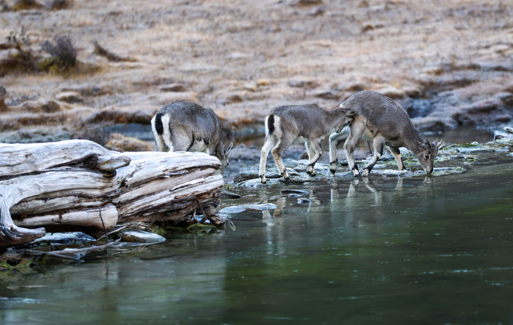 ↑在稻城亞丁景區貢嘎措,一群岩羊在喝水(10月27日攝)。新華社記者江宏景攝