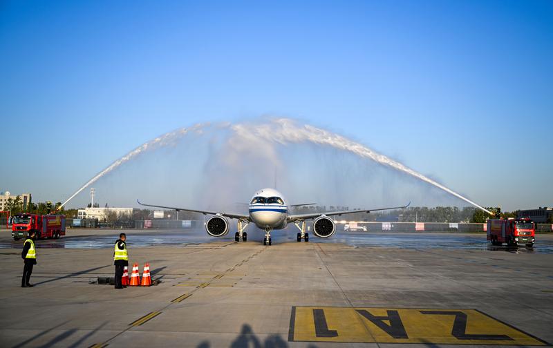 16時許,飛機平穩降落在天津濱海國際機場,接受民航最高禮遇“過水門”。