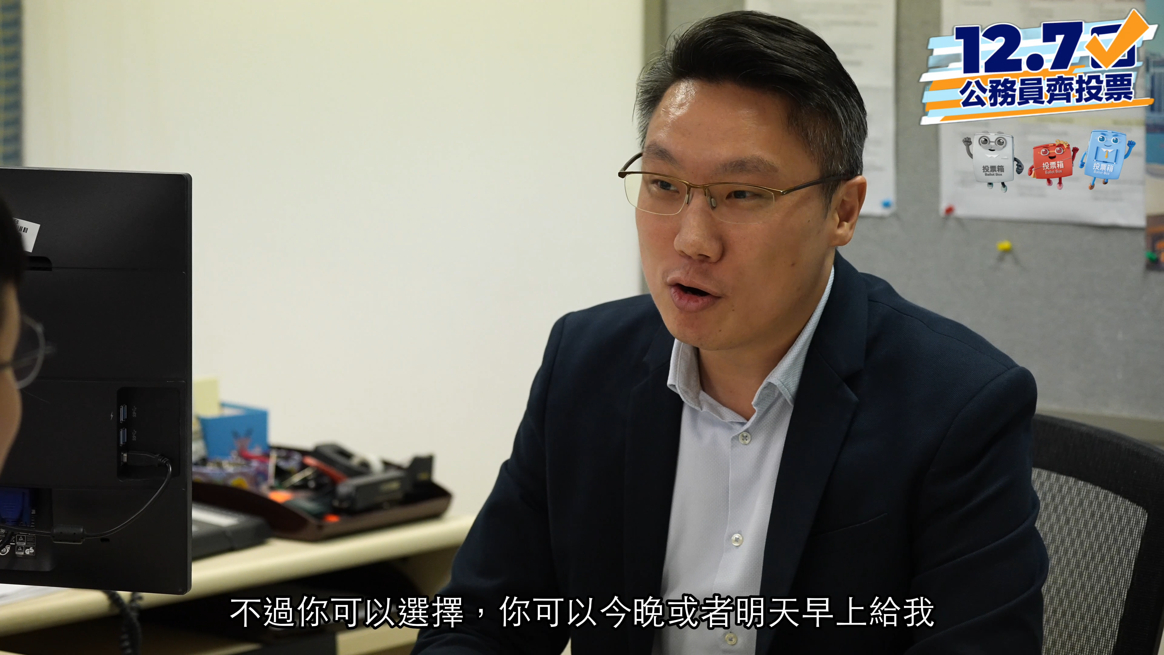 公務員學院同事發揮小宇宙,創作不同影片,讓同事緊記12月7日立法會選舉齊投票。上段影片透過選擇飲品的小劇場帶出「自己揀」的重要性,今次作為工作伙伴的訓練主任Eric和Tatton化身上司下屬,一同實踐呼籲公務員同事投票。