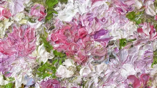 花在他的畫中不再是具象的花,而是意識的投射,是記憶與感知的交疊。畫面的層疊色彩,象是霧氣般的情緒沉積,偶然顯影出童年記憶中母親縫製被單與枕頭上的紅花——那是一種深層的自愈圖景。