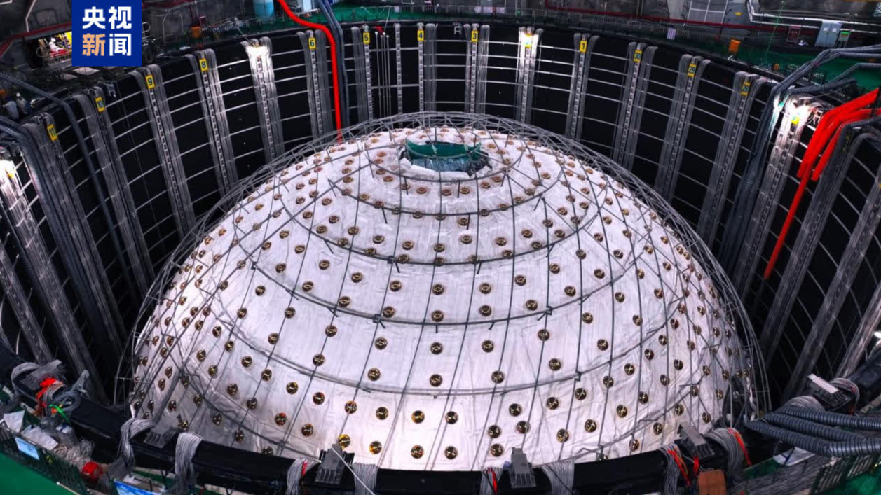 江門中微子實驗由中國科學院高能物理研究所於2008年提出構想,2015年啟動隧道和地下實驗室建設。2021年12月完成實驗室建設並開始了探測器在地下實驗室的安裝建設。江門中微子實驗的核心探測器為有效質量達2萬噸的液體閃爍體探測器,安置於地下實驗大廳44米深的水池中央。直徑41.1米的不鏽鋼網殼作為主支撐結構,承載了包括35.4米直徑的有機玻璃球、兩萬噸液體閃爍體、兩萬隻20英寸光電倍增管、兩萬五千隻3英寸光電倍增管以及前端電子學、防磁線圈和隔光板等眾多關鍵部件。遍布探測器內壁的光電倍增管協同工作,探測中微子與液閃相互作用產生的閃爍光,並將其轉換為電信號輸出。