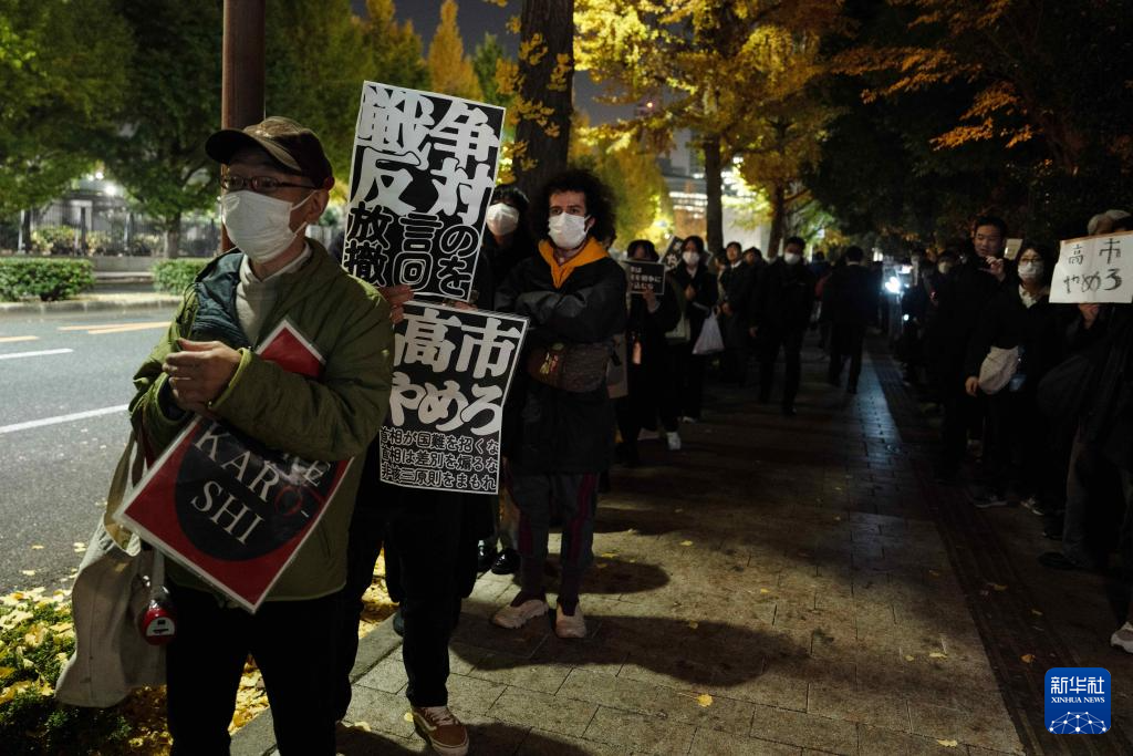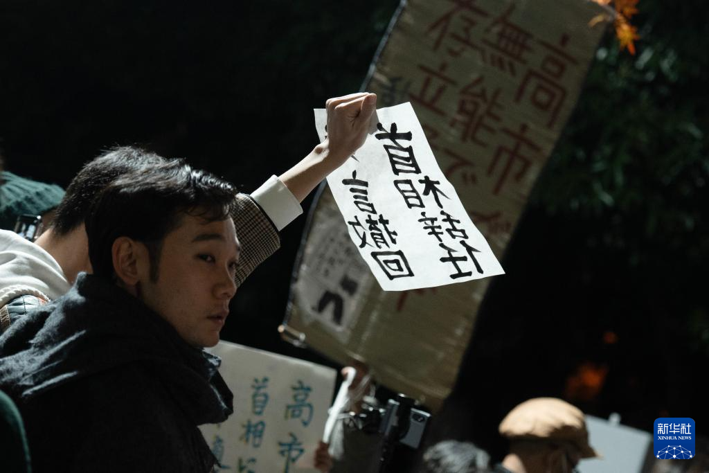 集會定於當地時間20時開始。19時前後,便有民眾陸續趕到現場。抗議者們舉着寫有“撤回言論反對戰爭”“因高市纔有事”“高市下台”等標語的牌子,高喊“禁止軍國主義復燃”等口號。多名抗議者要求高市對其涉台言論負責並辭去首相職務。