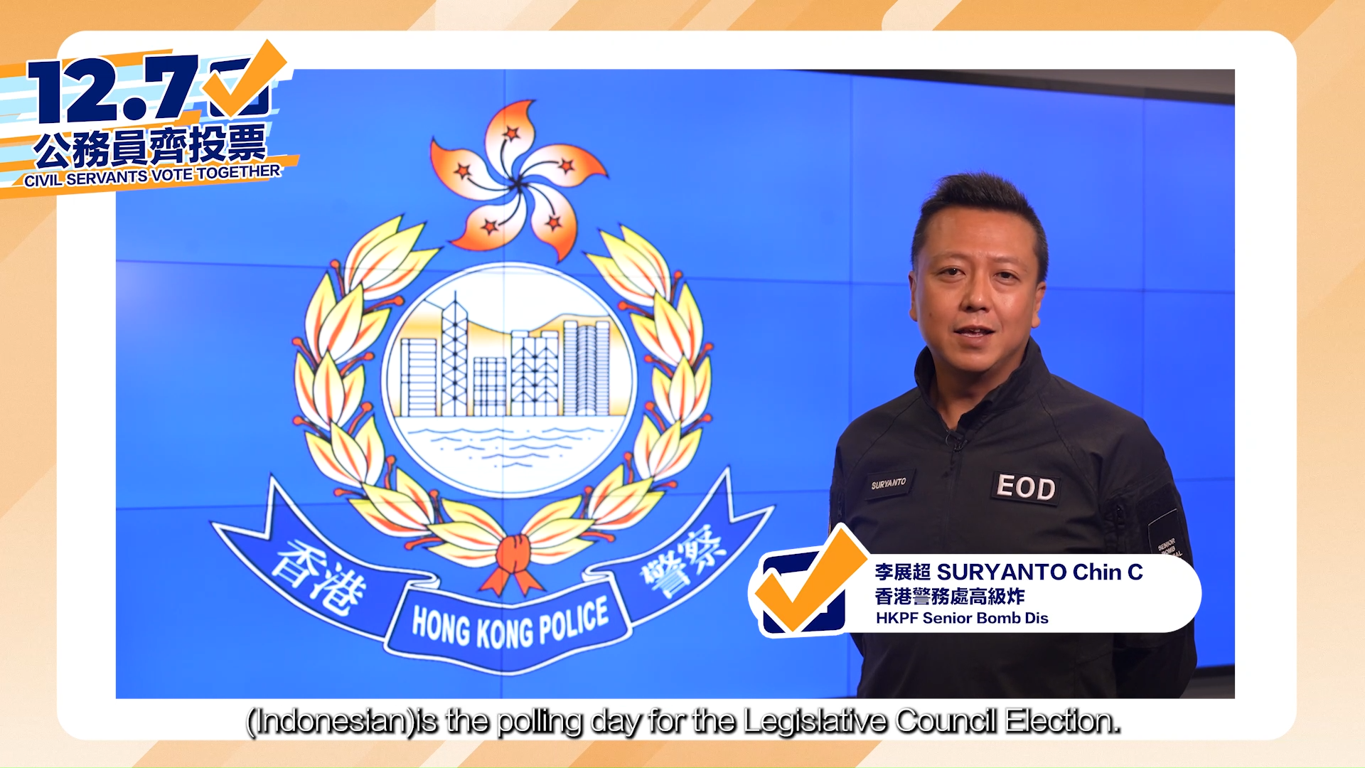一個星期前,公務員事務局局長楊何蓓茵邀請了三名公務員同事,分別以上海話、台山話和四川話,呼籲本身是選民的鄉親,在十二月七日立法會選舉齊投票。十一月二十三日,楊何蓓茵很高興邀請到來自紀律部隊的特別嘉賓為我們拍攝短片,作出12.7齊投票的號召。究竟這名特別嘉賓是誰?他會以哪一種語言作出呼籲?答案就是在九月中鰂魚涌拆彈行動中「一戰成名」的警方爆炸品處理課高級炸彈處理主任、人稱「展超Sir」李展超(SURYANTO Chin Chiu)。
