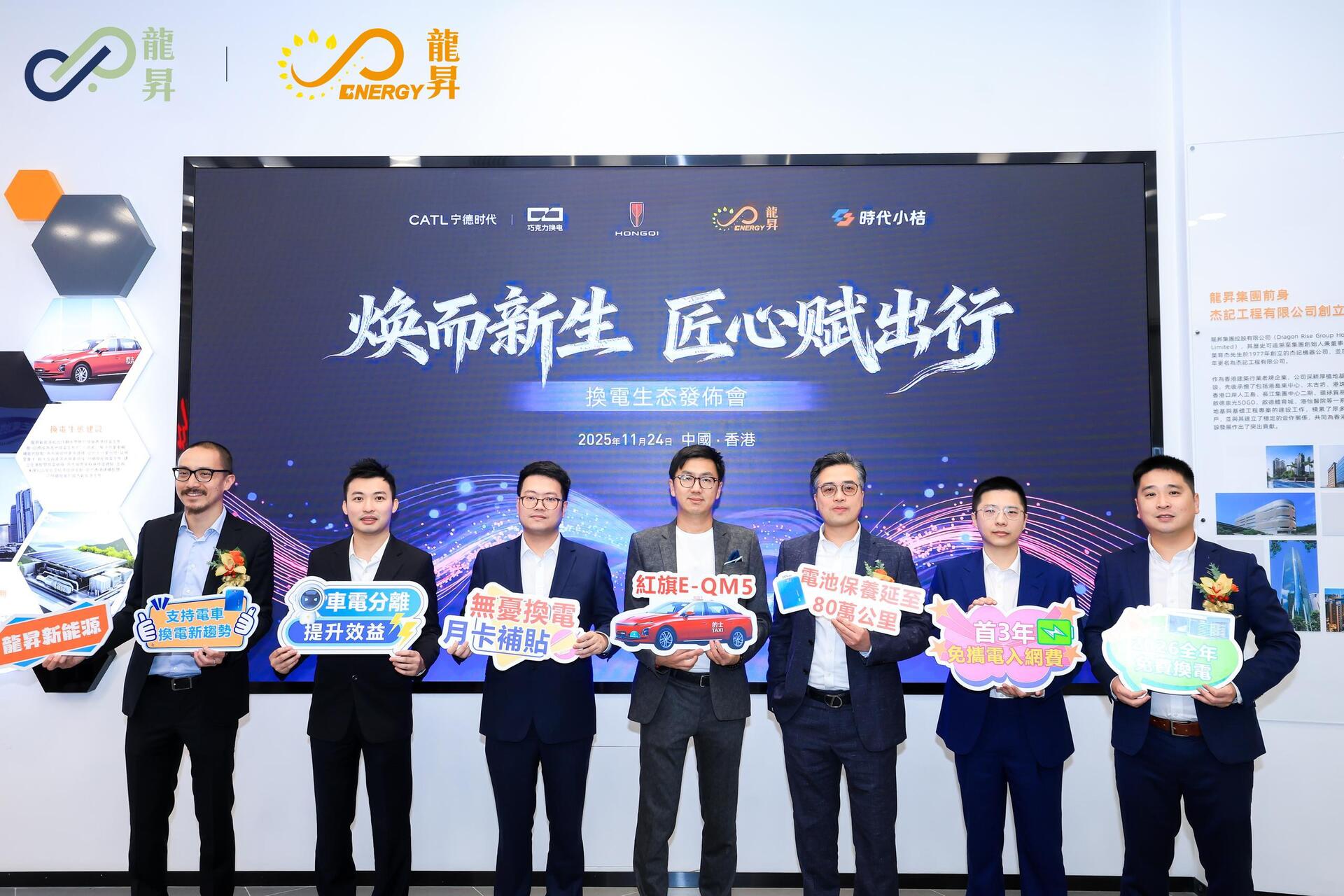 龍昇新能源控股有限公司首席執行官黃釗先生表示,針對香港的士行業對車輛續航、補能效率的核心訴求,E-QM5右軚版搭載高效換電技術,可於99秒實現極速換電補能,完美解決傳統充電模式耗時過長的行業痛點,加上車長達5米,車寬達1.9米,前後座椅距離達1.1米,為乘客提供頭等艙的空間體驗,完全適合香港市民追求優質出行服務的市場需要。預計 2026年第一季交車時將會有3個換電站(包括粉嶺及青衣)完善及投入服務,並計劃於2026年底前將加設5個、至2027年將會於全港共設立不少於14個換電站,為全港用戶提供方便快捷的換電服務。現時龍昇新能源控股有限公司已接獲“紅旗”E-QM5型號右軚版可換電新能源的士意向性訂單300輛,並預計明年第一季交車。