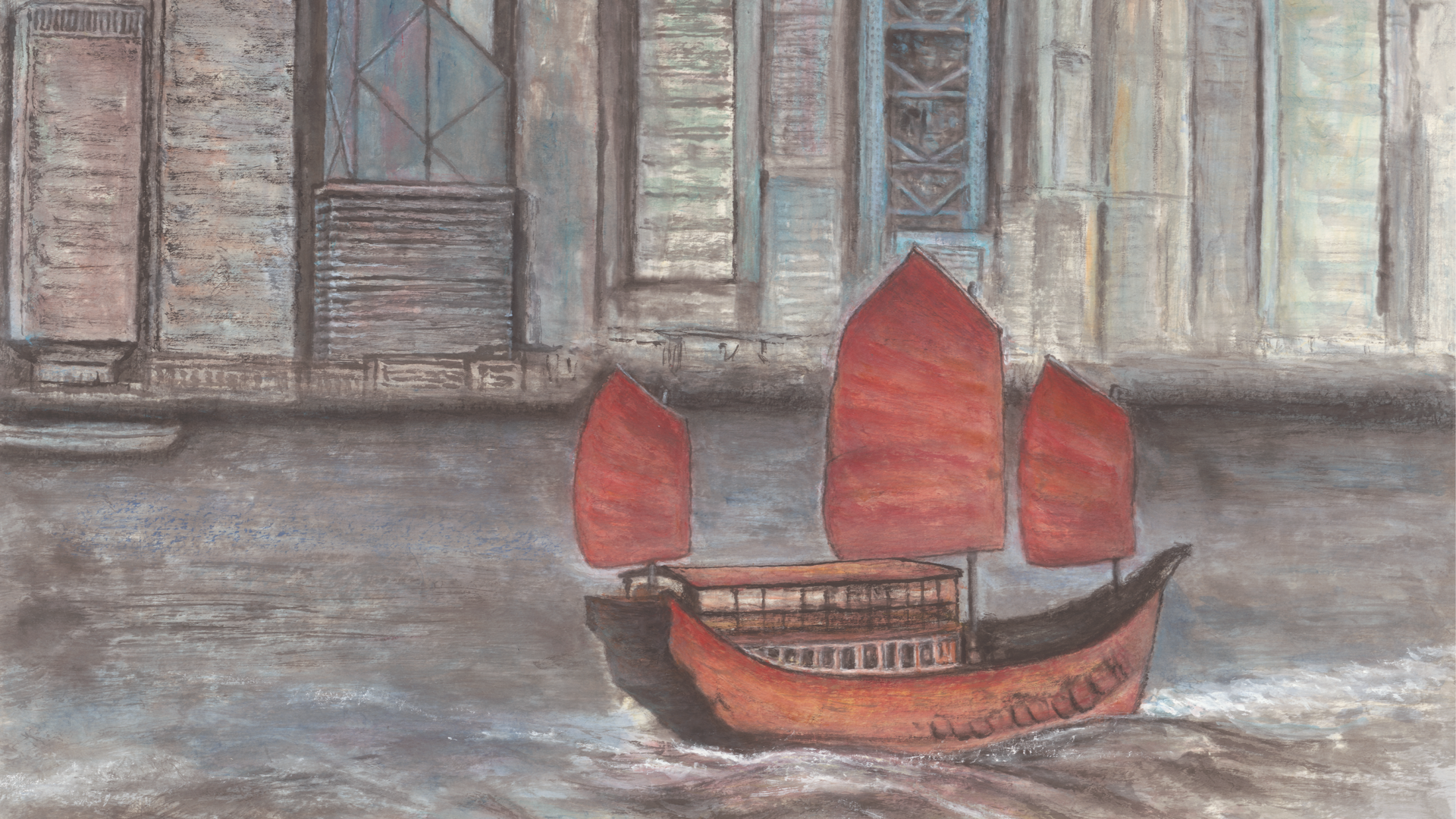 另一方面考慮空間與意境的營造:畫面空間從前景的漁船,到中景的海面,再到背景的樓群,形成了一種深遠的空間層次感。天空與海水的暈染,延伸了國畫的意境,讓都市景觀具備了水墨的詩意氣質。這種布局不僅符合傳統畫作的視覺邏輯,也暗喻了香港從歷史走向現在、邁向未來的時間序列。色彩觀念上,紅帆船的硃砂色、建築群落的淡青灰色形成鮮明對比。紅帆的“豔”與都市的“灰”,既強化了視覺焦點,又隱喻香港在傳統底色上進發的現代活力,以鮮明的姿態參與現代敘事。