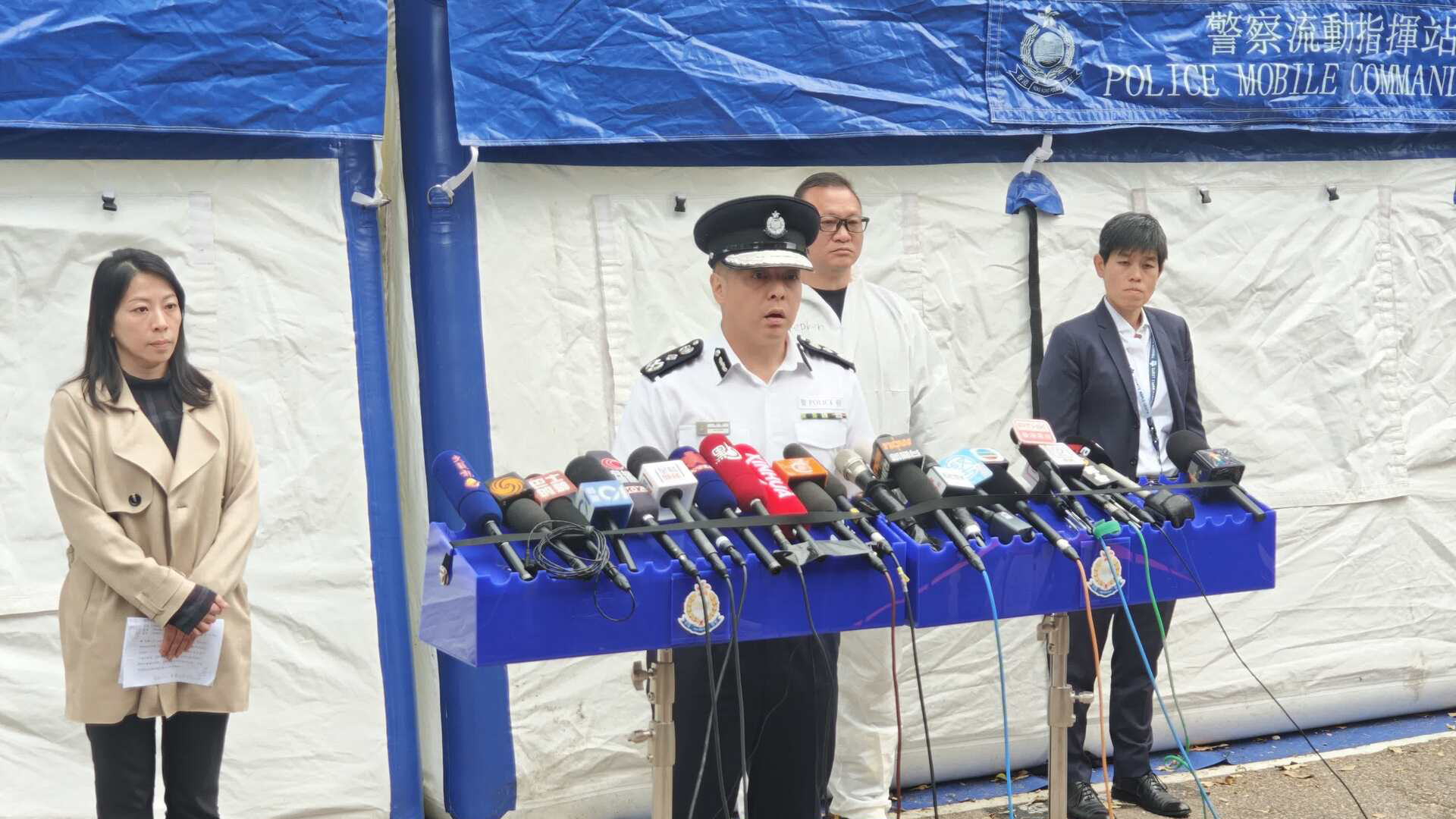 大埔宏福苑11月26日發生五級大火,災難遇害者辨認組(DVIU)今日(12月3日)繼續到火災現場進行搜索,警方今日下午舉行記者會,交代搜證及調查工作的最新進展。警務處處長周一鳴表示,警方現已完成全部7座大廈的搜索工作。