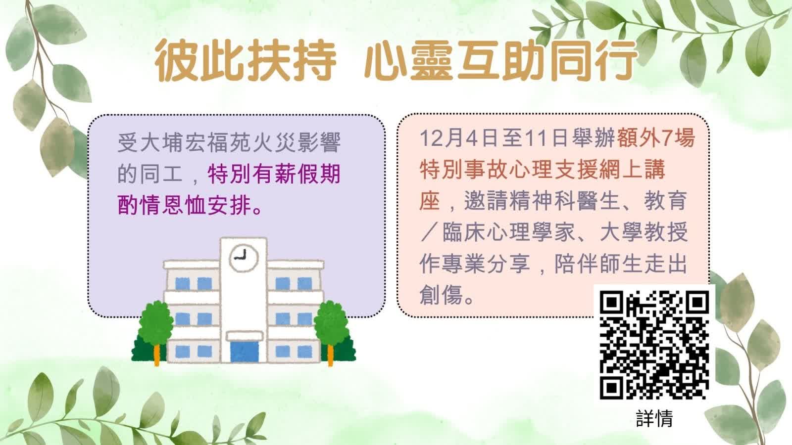 蔡若蓮表示,為持續關顧同工的心靈健康,同時讓更多學校人員及家長了解學童在創傷事件後常見的身心反應及情緒需要,並學習應對策略和支援方法。教育局將於12月4日至11日期間,舉辦額外7場特別事故心理支援講座,以網上形式進行,並邀請不同講者,包括精神科醫生、教育/臨床心理學家、大學教授作專業分享。