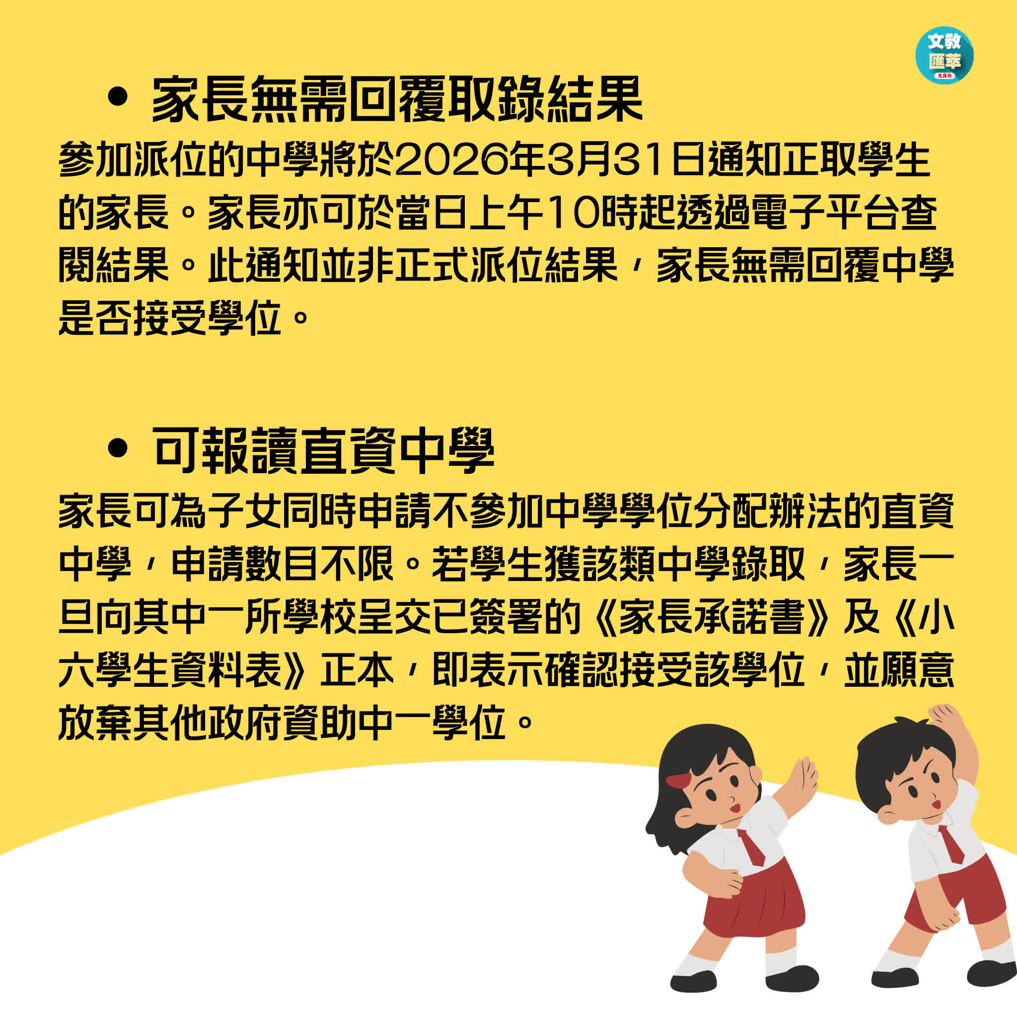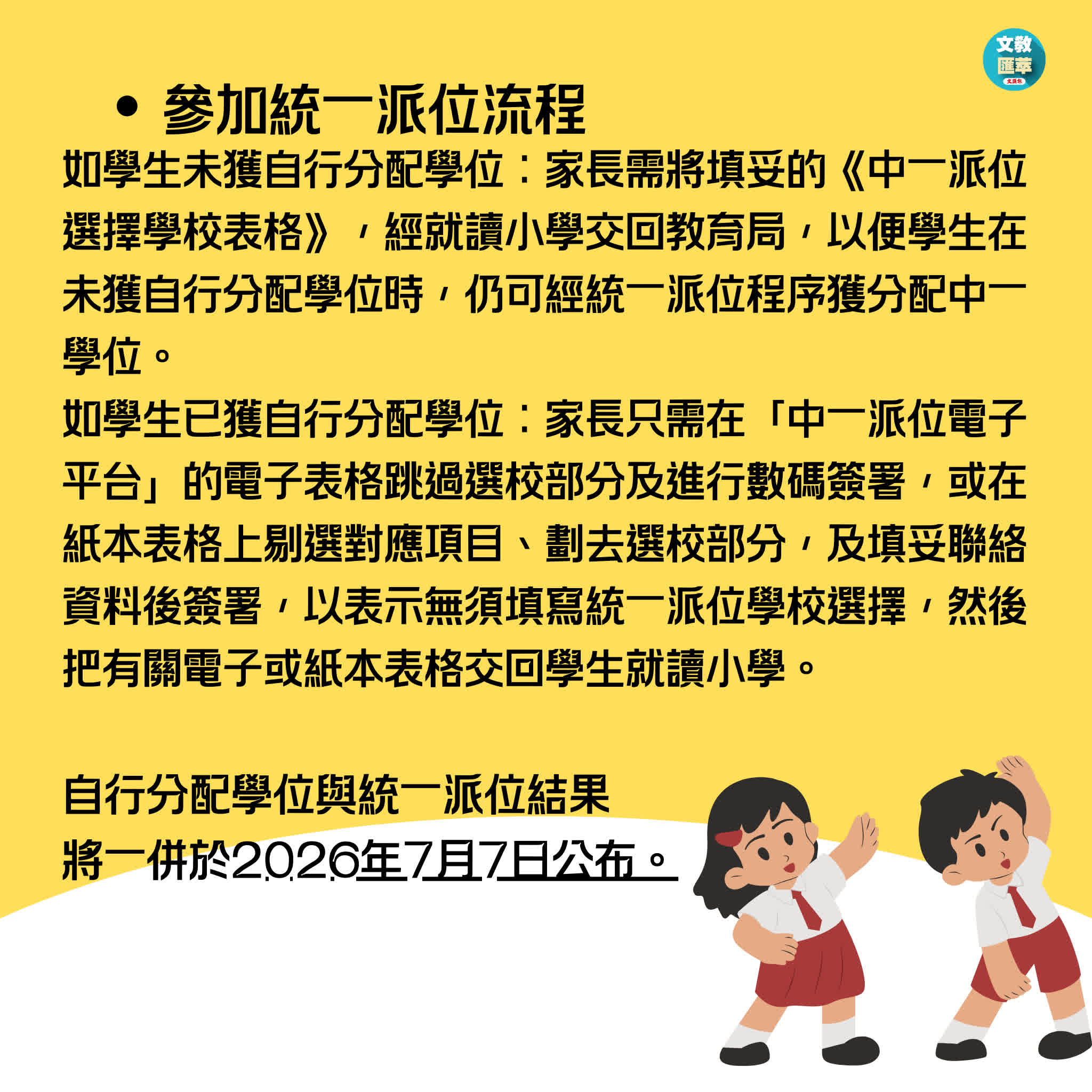 特區政府教育局早前發布公告,提醒參與2026年中學學位分配辦法(中一派位)的小六學生家長,如欲為子女申請官立、資助、按位津貼中學及參加派位的直資中學的自行分配學位,須於1月2日至16日期間向有關中學遞交申請。已登記為「中一派位電子平台」用戶並以「智方便+」綁定帳戶的家長,可於明日(5日)起透過電子平台瀏覽《中學概覽》提供的升中選校相關資訊,並於稍後時間遞交自行分配學位申請及查閱結果。自行分配學位階段的派位結果將於7月7日與統一派位結果一併公布。