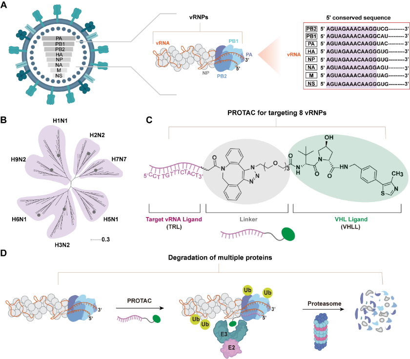 劉書琳介紹,該團隊開發了一種名為“多路複用PROTAC”的抗病毒策略。其核心機制在於巧妙地利用了靶向病毒RNA中一段高度保守、被視為“通用密碼”的5’非翻譯區。基於此,他們團隊的研究人員設計了一種多功能PROTAC分子,該分子一端能精準識別並結合病毒“通用密碼”,另一端則負責招募人體細胞內固有的蛋白質降解系統——蛋白酶體。這種設計使得該分子如同一位“特洛伊木馬”,進入被感染的細胞後,能同時鉤住病毒複製核心——病毒核糖核蛋白複合體和細胞的“粉碎機”,從而為病毒的核心蛋白打上“銷燬”標記,進而引導細胞機器將這些病毒複製的關鍵零件徹底降解,從源頭上摧毀病毒的複製能力。