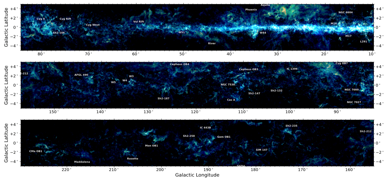 “銀河畫卷”巡天計劃是一項大規模毫米波分子譜線巡天計劃。該巡天覆蓋北天銀道面附近(銀經10至230度,銀緯±5.25度)2310平方度天區,通過探測星際一氧化碳及其同位素分子氣體發出的毫米波譜線信號,高精度描繪出銀河系分子氣體的分布與結構。科研團隊自2011年起,歷時10餘年完成一期巡天,累計獲取超過1億條譜線數據,構建了目前最完備的毫米波一氧化碳分子譜線數據庫,為銀河系研究提供了前所未有的全景視角。