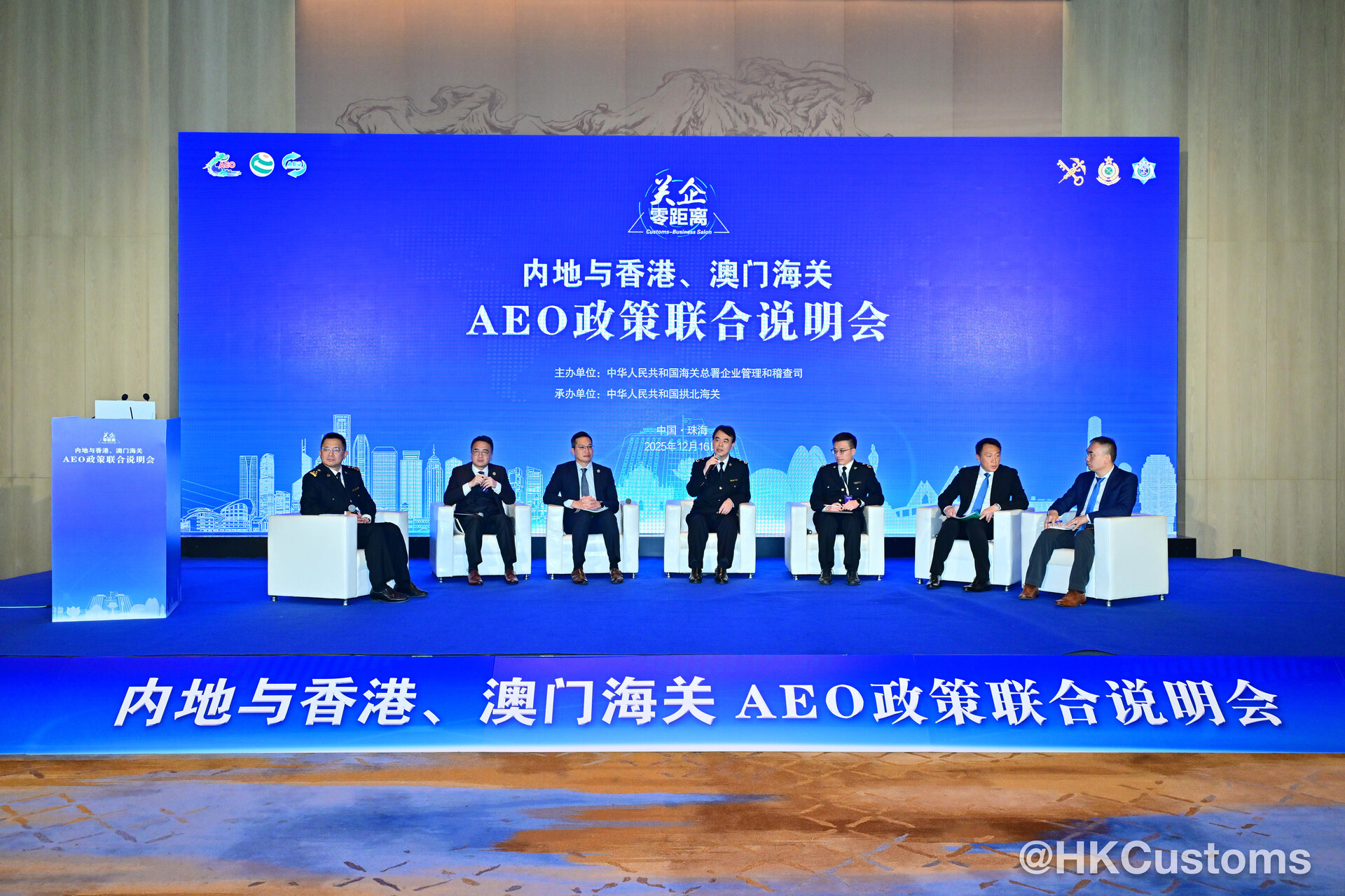 2025年12月16日香港海關率領香港AEO代表團到珠海出席由海關總署舉辦的「內地與香港、澳門海關AEO政策聯合說明會」。是次活動吸引來自香港、粵港澳大灣區400多間企業,接近500名代表參與。