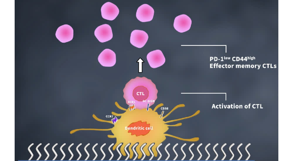 樹突細胞治療是透過分離病人血液中的單核細胞,在體外與腫瘤抗原共同培養成成熟樹突細胞,再回輸體內協助免疫系統攻擊癌細胞。該療法雖副作用較少,但療效不穩定、製備亦繁瑣。為突破瓶頸,教大科學與環境學系生物與神經科學講座教授、兼協理副校長(知識轉移與可持續發展)的翁建霖領導團隊,研發出天然無毒且高度生物相容的二氧化矽納米基質,能以安全高效方式促進樹突細胞成熟,並顯著增強T細胞對癌細胞的識別與攻擊能力,從而克服癌細胞「偽裝」問題、提升靶向精確度。