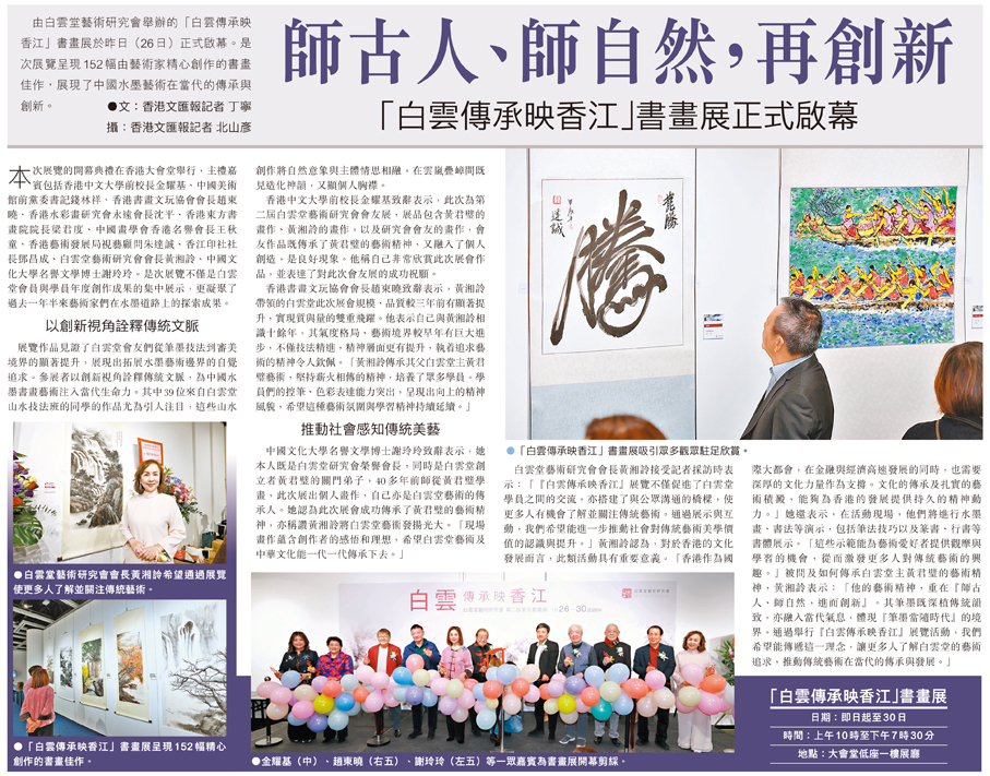 本次展覽的開幕典禮在香港大會堂舉行,主禮嘉賓包括香港中文大學前校長金耀基、中國美術館前黨委書記錢林祥、香港書畫文玩協會會長趙東曉、香港水彩畫研究會永遠會長沈平、香港東方書畫院院長梁君度、中國畫學會香港名譽會長王秋童、香港藝術發展局視藝顧問朱達誠、香江印社社長鄧昌成、白雲堂藝術研究會會長黃湘詅、中國文化大學名譽文學博士謝玲玲。是次展覽不僅是白雲堂會員與學員年度創作成果的集中展示,更凝聚了過去一年半來藝術家們在水墨道路上的探索成果。