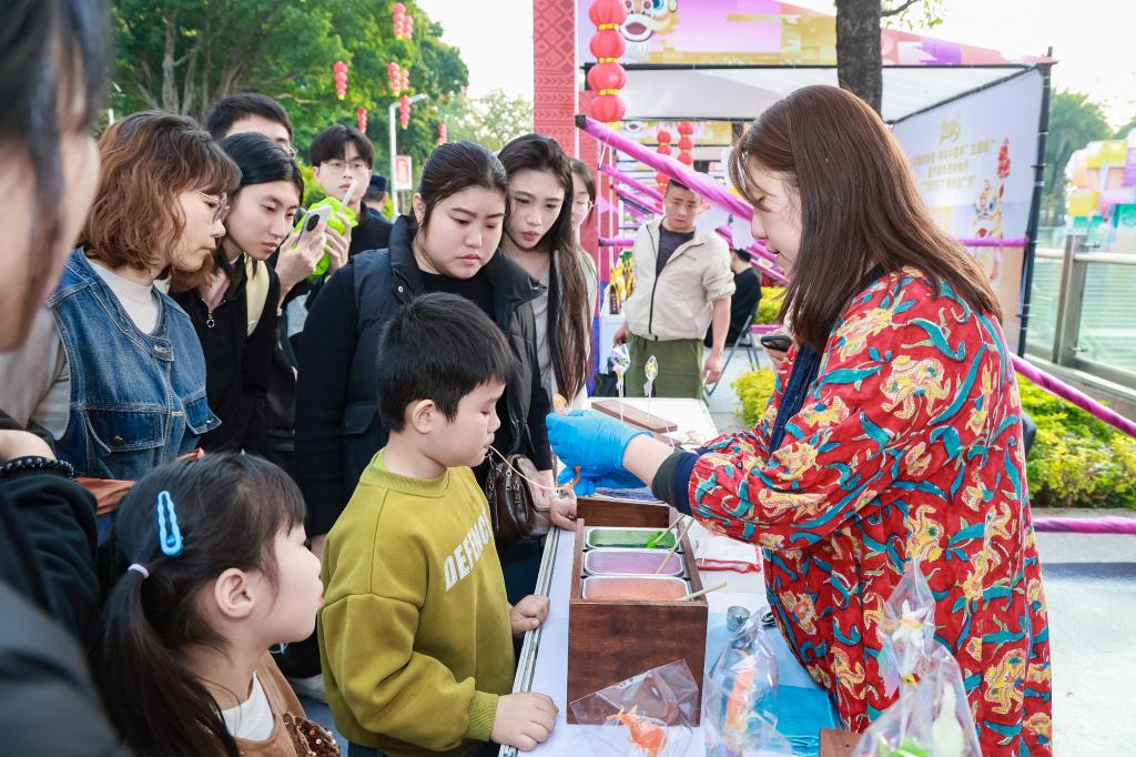 “慢慢吹,我來給你捏一個小豬。”在香港非物質文化遺產辦事處的展位前,香港吹糖人師傅薛錦屏一邊為遊客介紹吹糖人的歷史,一邊用糖料捏成各種生動造型。“我很喜歡這次活動的氛圍,除了讓大家體驗吹糖工藝,我也有機會去接觸全國各地的非遺項目,和其他傳承人相互交流。”薛錦屏說。