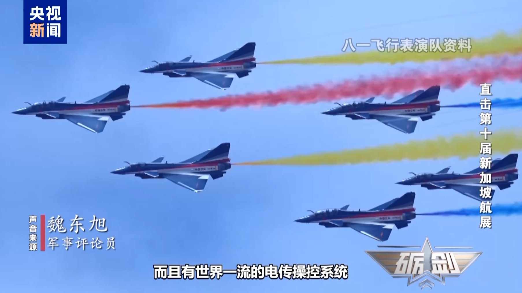 軍事評論員 魏東旭:六機同步橫滾是非常有難度的。殲-10C六機編隊是以一種密集的編隊同步進行橫滾。先進噴氣式戰鬥機距離比較近,飛機之間是有氣流乾擾的。還要進行同步的橫滾動作,對於飛行員操控飛機,還有飛機的性能都提出了很高的要求。