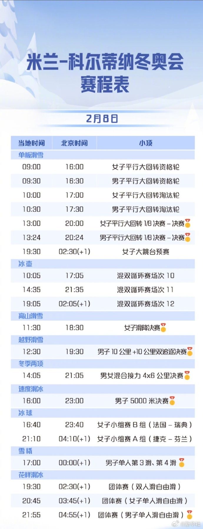 2月8日,米蘭冬奧會賽程表如下↓↓