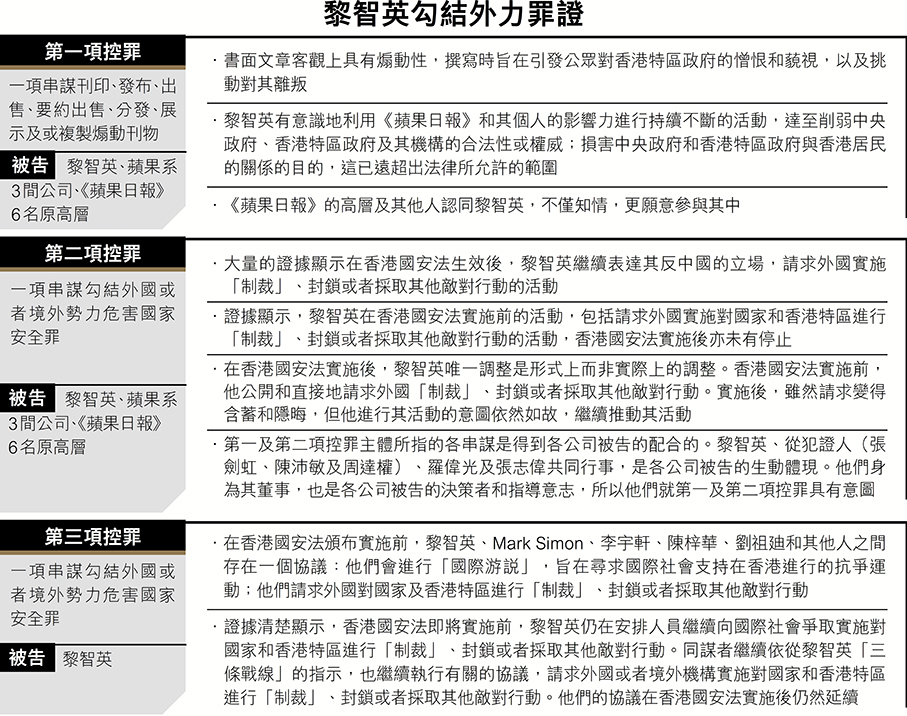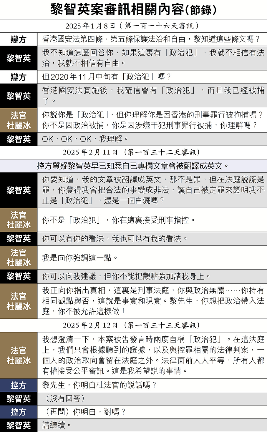 根據800多頁的判詞,法庭在裁決理由中清楚表明,黎智英並非因其政治觀點或信念受審。法庭單純考慮有關的法律和案中證據,以決定控方是否已把各被告面對的控罪證明至毫無合理疑點。