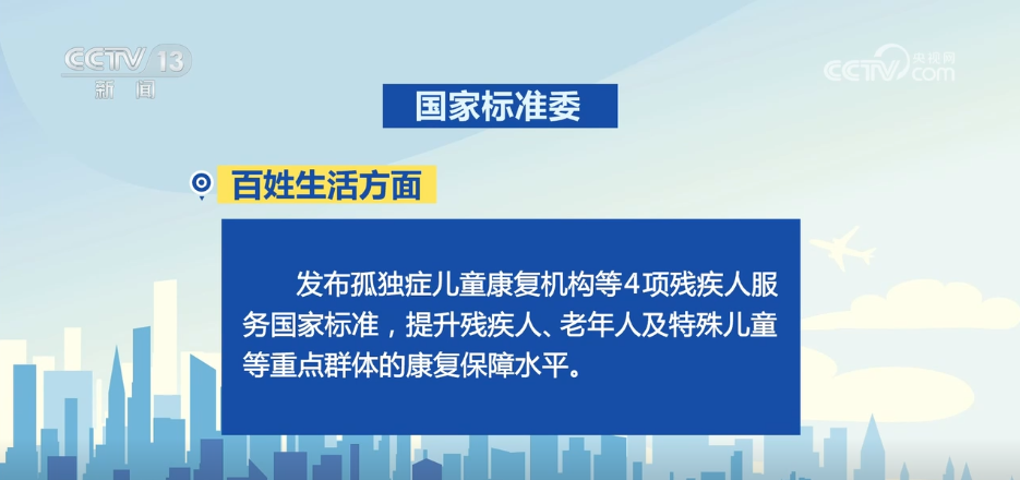 在百姓生活方面,發布孤獨症兒童康復機構等4項殘疾人服務國家標準,提升殘疾人、老年人及特殊兒童等重點群體的康復保障水平。