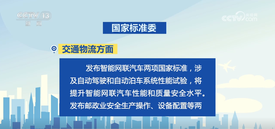 在交通物流方面,發布智能網聯汽車兩項國家標準,涉及自動駕駛和自動泊車系統性能試驗,將提升智能網聯汽車性能和質量安全水平。發布郵政業安全生產操作、設備配置等兩項強制性國家標準,針對郵政和快遞企業提出收寄、分揀、運輸、投遞等各環節安全生產操作規範和設備配備要求。